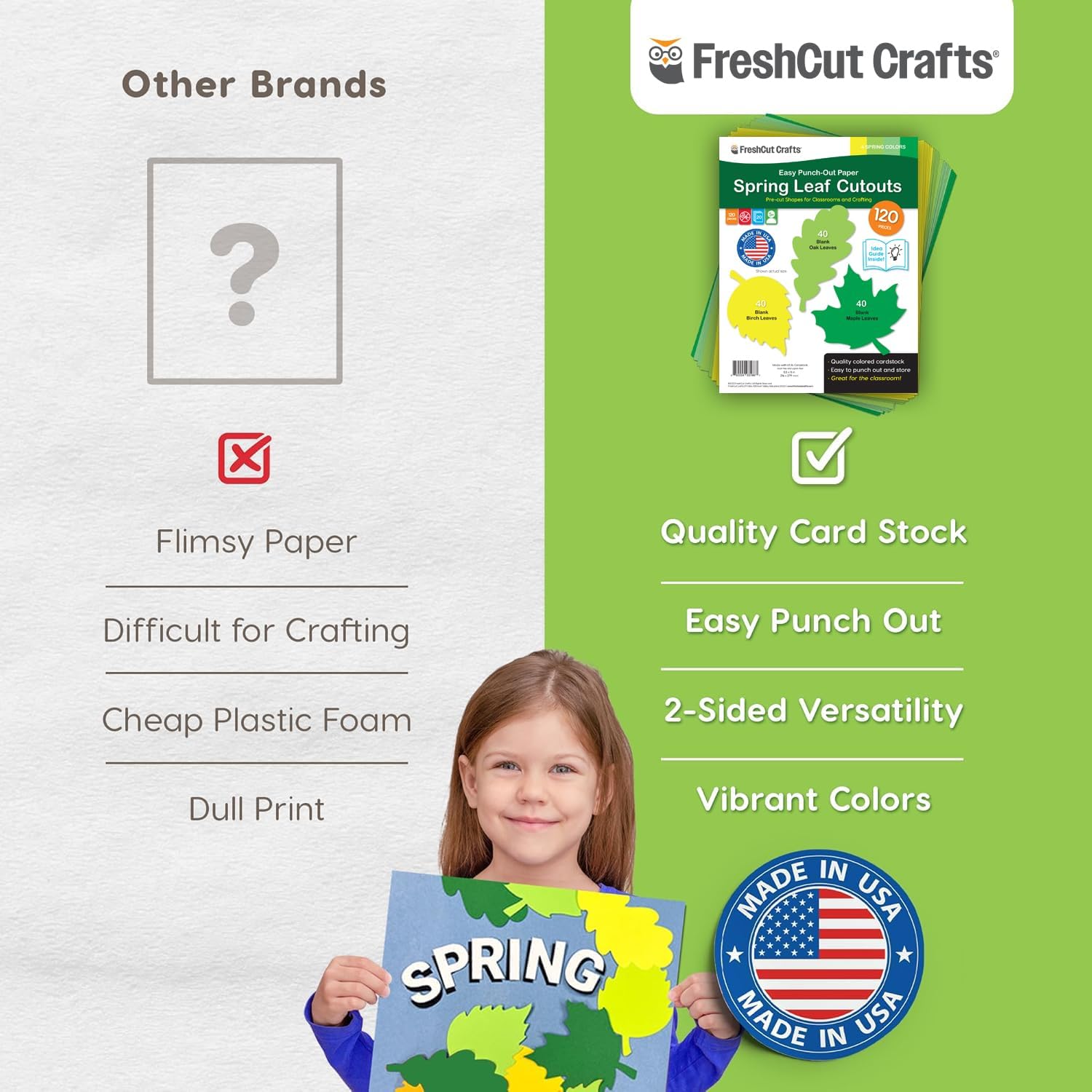 - LEAFY CREATIVITY: Create a lush Spring scene with our set of 120 punch-out Spring leaf cutouts! Each leaf is expertly crafted from high-quality card stock, offering a stunning array of shades in bright green and yellow. But that's not all - included inside is an IDEA GUIDE, filled with 12 innovative ways to use our paper leaf shapes. Whether you're crafting vibrant decorations or adding a natural touch to your scrapbooking these versatile cutouts are sure to inspire endless creativity