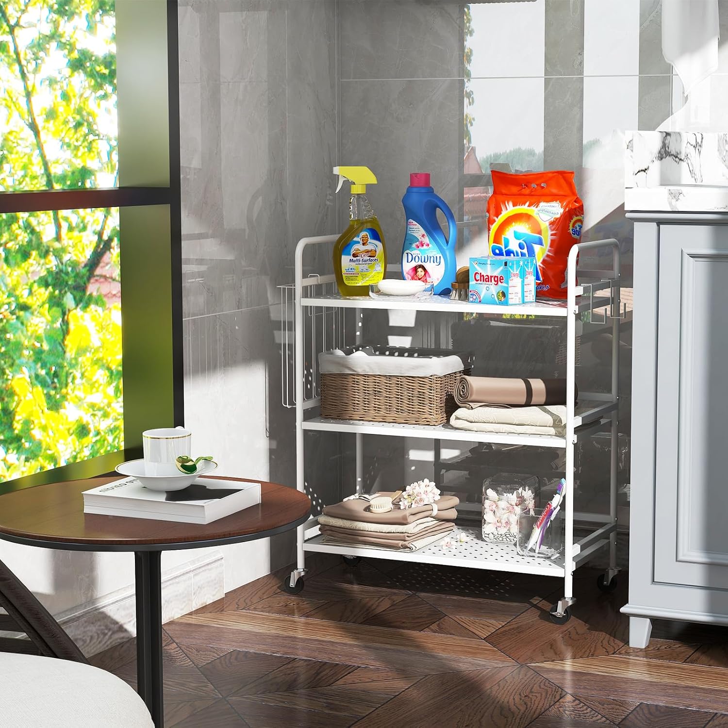 HDANI 3 Tier Metal Mesh Utility Cart,Large Capacity Multipurpose Heavy Vehicle,Rolling Trolley with to Hooks and One Basket(White)