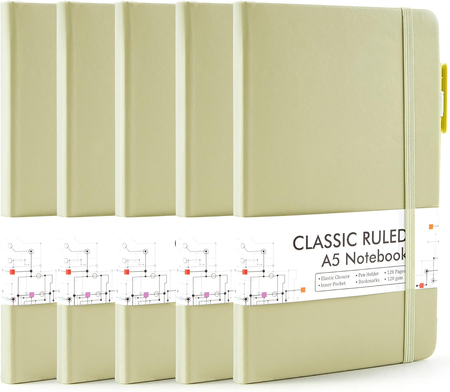 - Feela 5 Pack Classic Ruled Notebooks contains 5 Avocado Green ruled sturdy cover notebooks and 5 Black Retractable Pens. Each of the notebooks measures 8.3” x 5.1”, which is perfect to carry and easily held in hand. These black cute pens are customized to be placed in the pen holder, which is pretty convenient.
