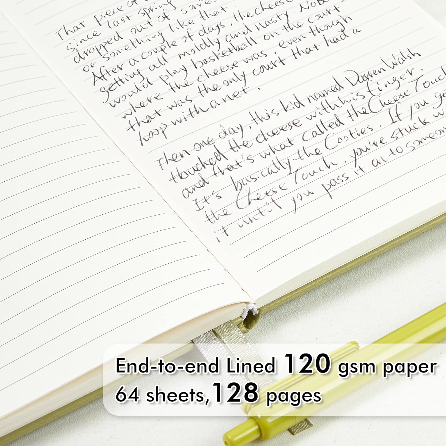 - These classic ruled notebooks are all blank inside with 128 lined pages (64 sheets), which would be convenient for daily usage. The hard cover journal has a water-resistant faux leather cover, round corners and bookmarks, which is designed to lay and open flat. There’s a “date/page” column on the top of every page. You can use it as a reminder to let you remember those important dates and find the page you want in a very short time.