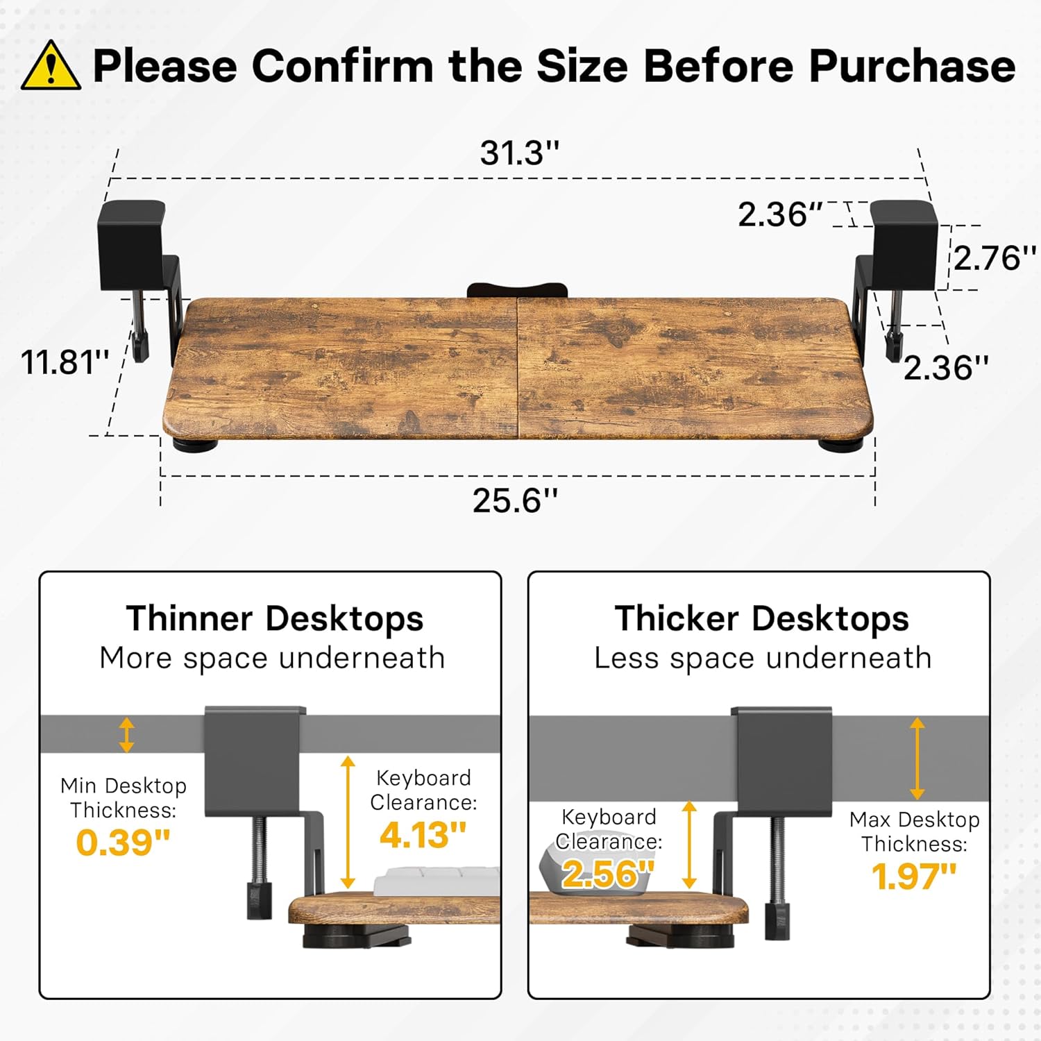 - ✅ MEASURE YOUR DESK BEFORE ORDERING – The tray requires at least 31.3" of width and 11.4" of depth underneath your desk to slide in and out smoothly. Confirm these dimensions to avoid fitment issues