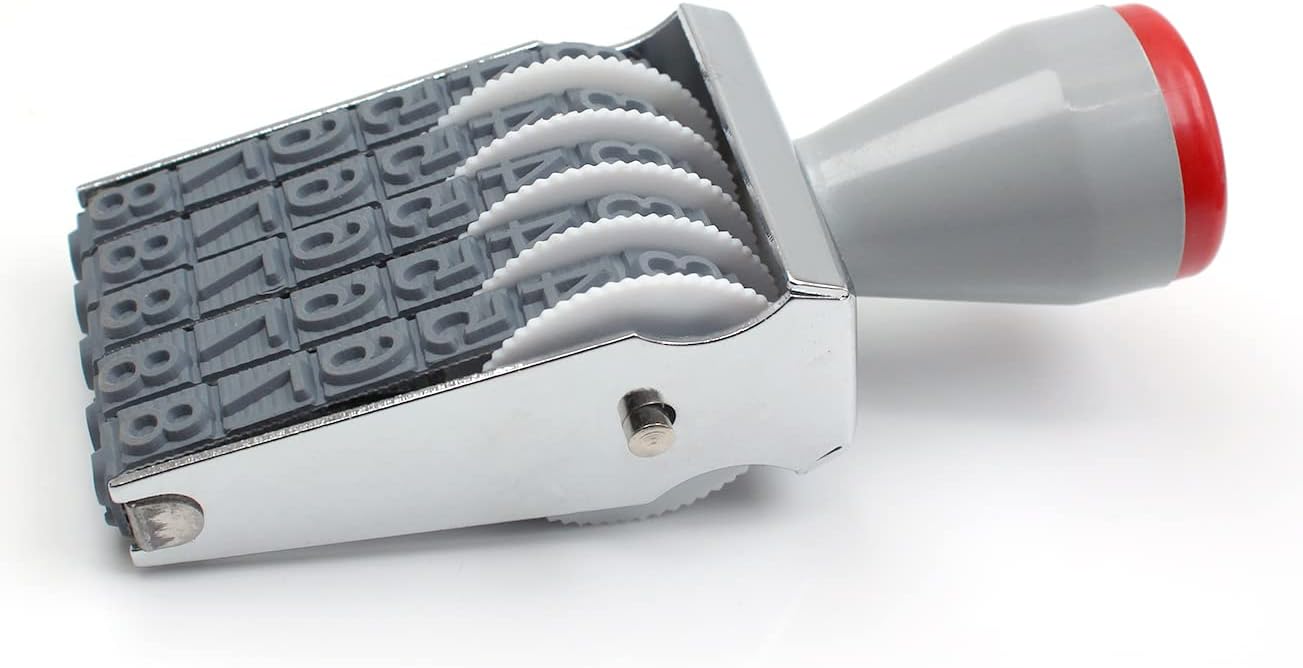 - Rubber stamp: Material : Metal/Plastic. Stamp Size:length :100 mm/3.93 in,Width:40 mm/1.57 in,High:25 mm/0.98 in,Impression Size : Width:5 mm /0.19 in,Height:7 mm/0.27 in,30 mm/0.18 in,Please refer to the picture, Color : Gray black, Weight: 60 g, Package Content : 1 X Numbering Stamp(Without ink Requires a separate ink pad)