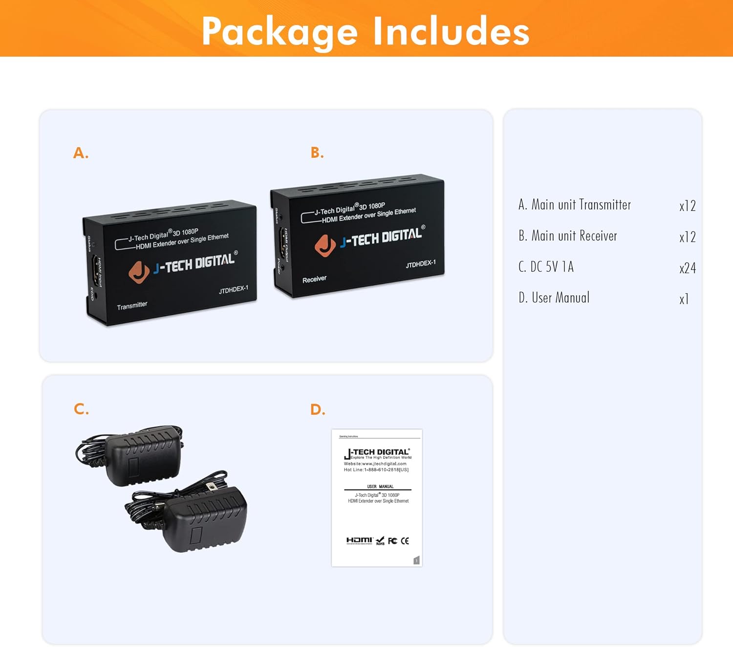 J-Tech Digital HDMI Extender 1080P 60Hz Over Single CAT 5e/6 Up to 200ft. | Deep Color, EDID Copy, Zero Signal Loss | Pack of 12 [JTDHDEX-1]