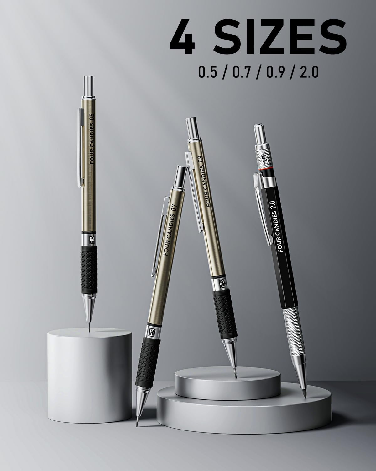 Four Candies 25PCS Art Mechanical Pencil Set with Case, 3PCS Metal Artist Lead Pencil 0.5, 0.7, 0.9 mm & 3PCS 2mm Holder (HB 2H 2B 4B Color) with 432PCS Graphite Lead Refills for Drawing Sketching