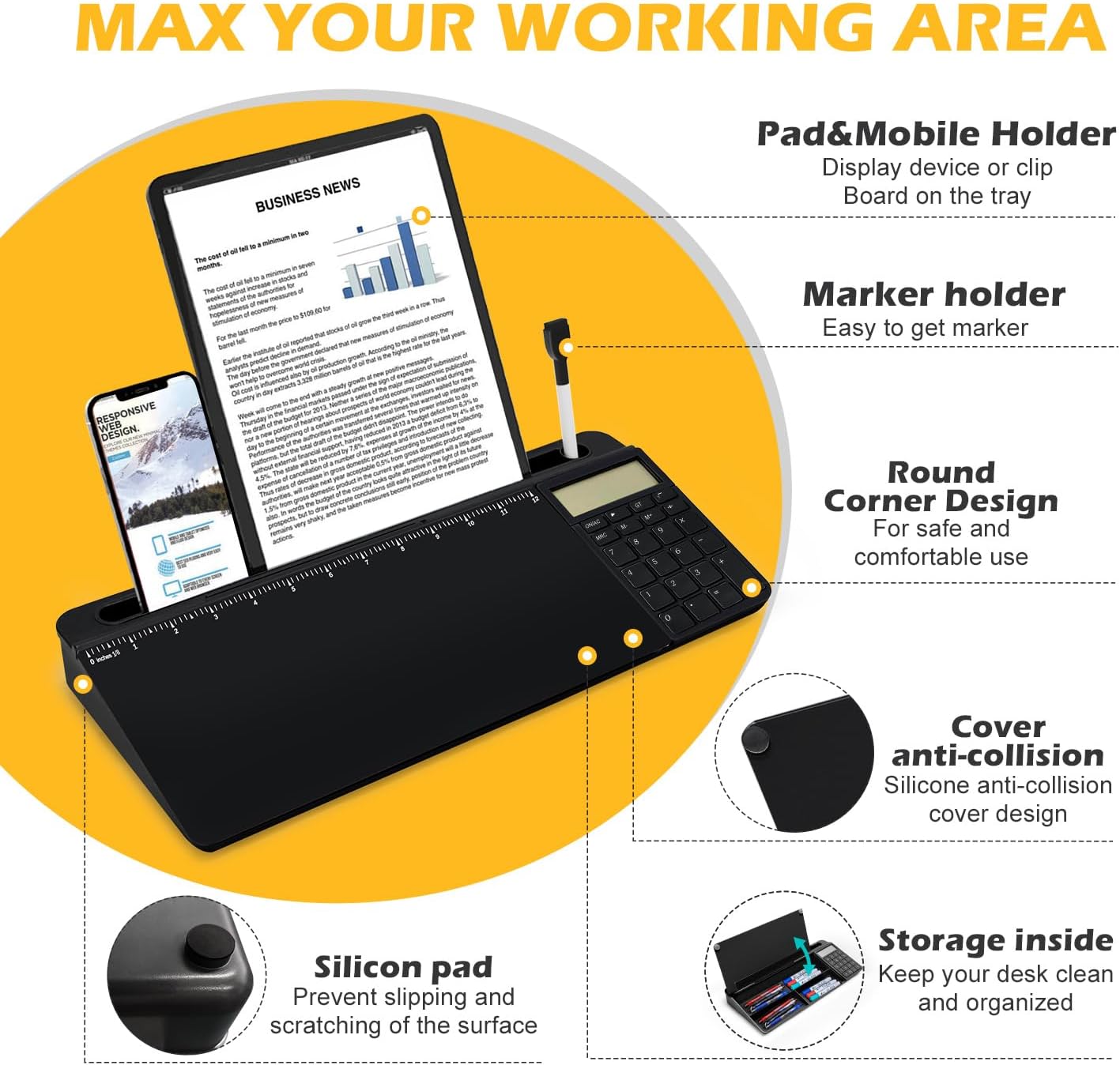 Desktop Glass Whiteboard with Calculator(12 Digit LCD Display) & Ruler Marker,Tilted Notepad Computer Keyboard Stand with Black Dry Erase Board Surface, Desk Organizers with Accessories,Black