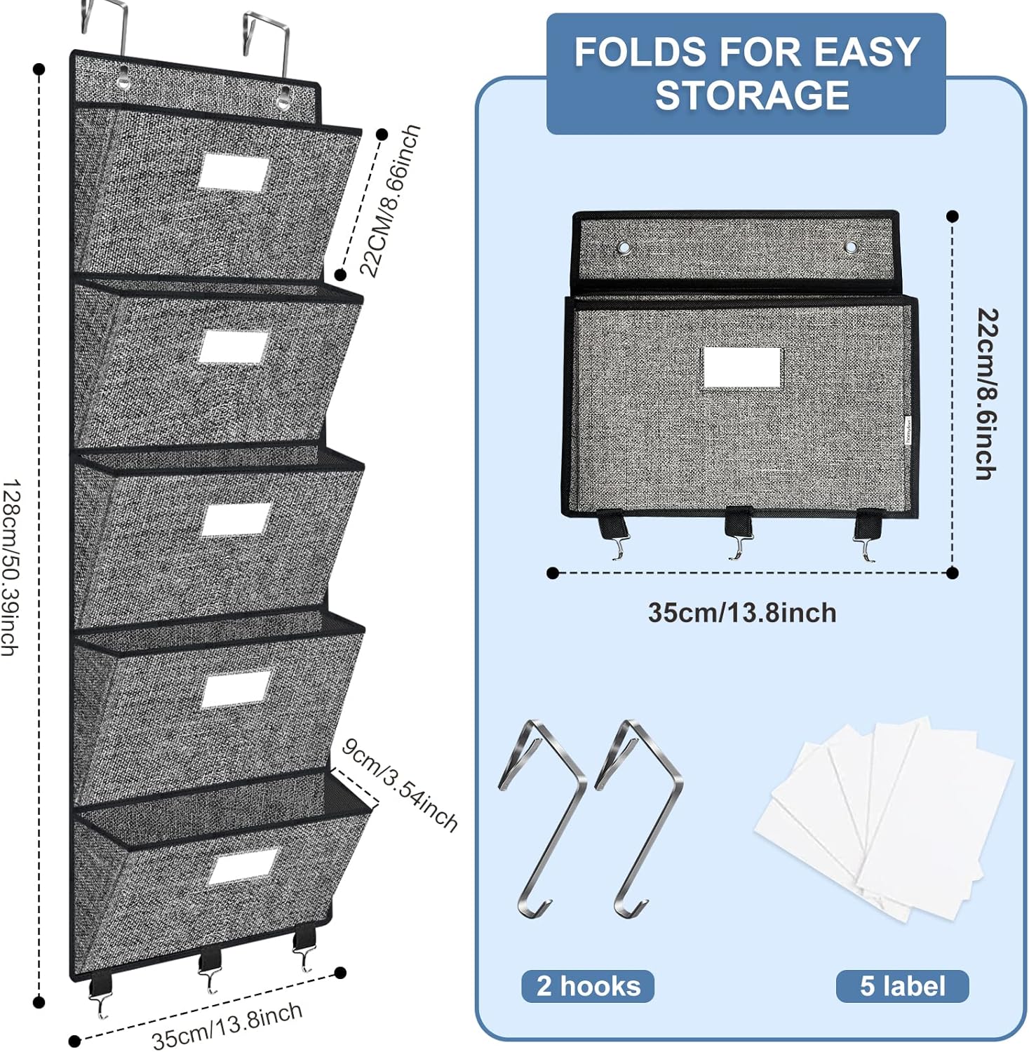 - 👍【5 Practical Hooks】: On top of these over the door file organizer, there are 2 big hooks for hanging over the door or mounted on the wall, on bottom there are also 3 small hooks for hanging small stuffs, such as keys, scissors, measuring tapes,etc.