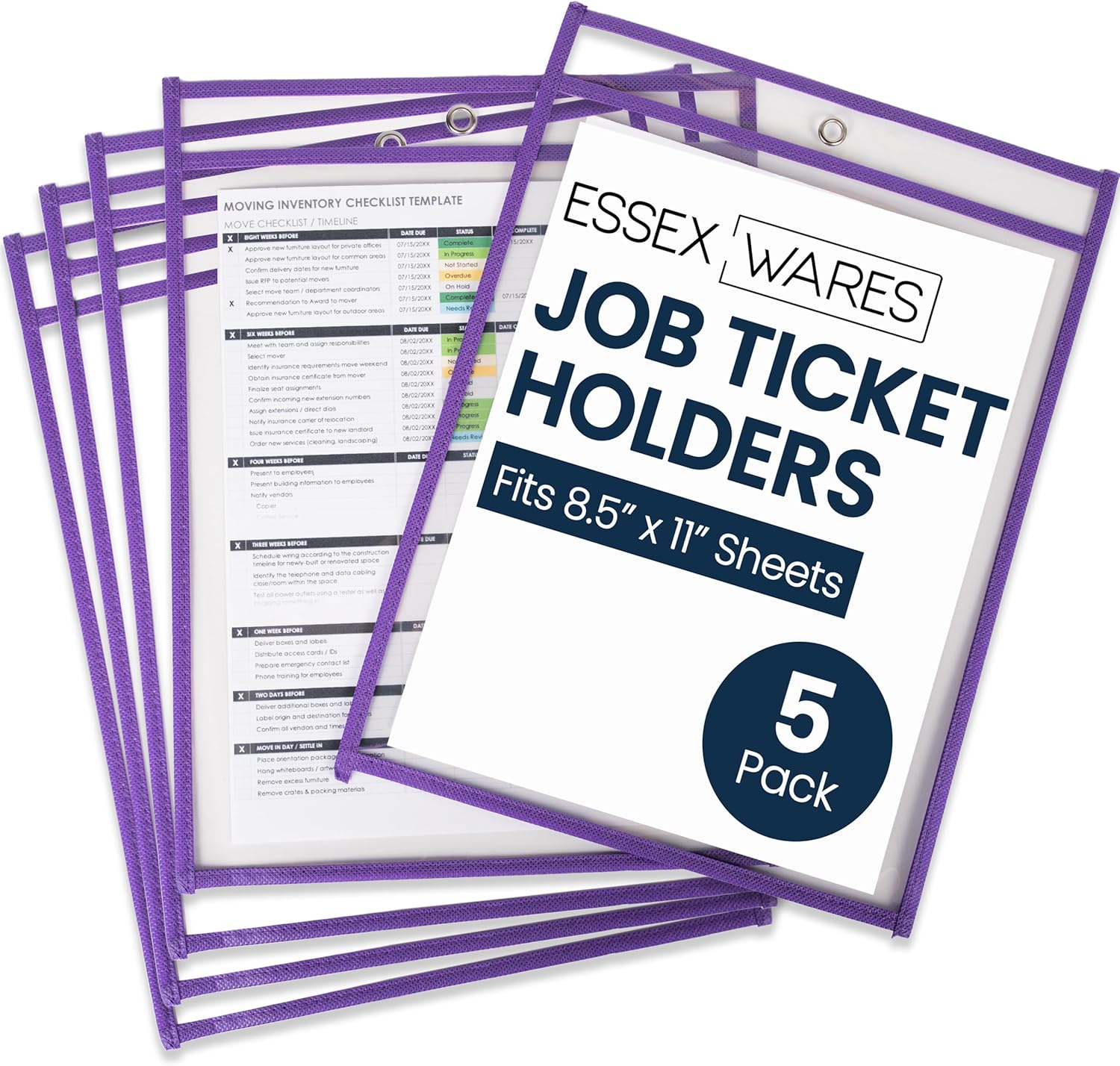 Essex Wares - 5 Pack, Purple, Job Ticket Holders, 10" Wide x 13.5" Tall - Clear Plastic Shop Ticket Holders - Easy to Use, Reusable & Easy Erase Plastic Invoice Holders, Water-Resistant & Durable