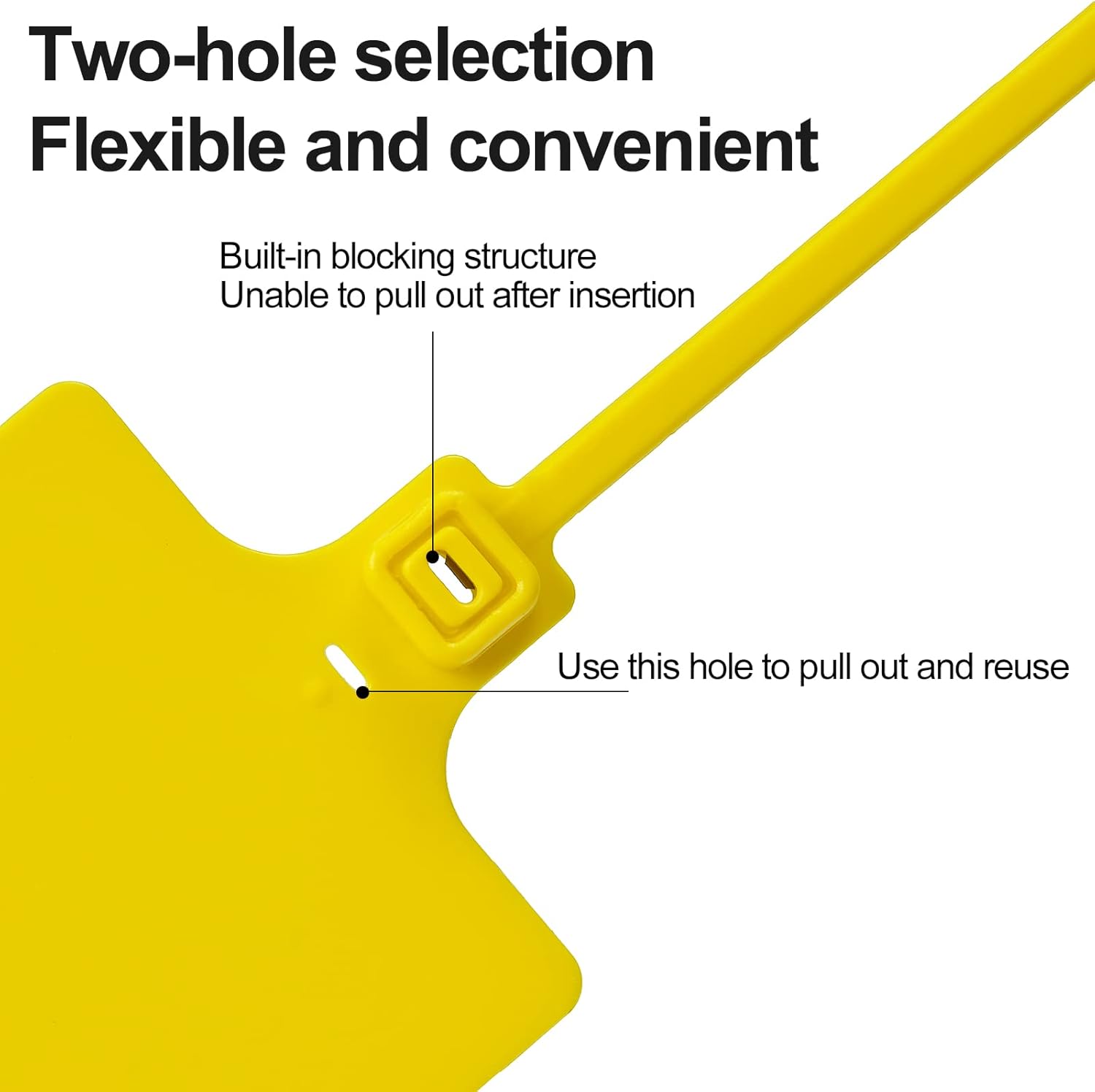 - 【Double Lock Design】: The identification tags design with 2 holes, single-use hole and reuse hole. The single-use hole can be self-locking for a tamper proof security seal, it cannot be pulled out once locked. The reuse hole can be applied many times. You can use two holes plastic tags according to your needs.