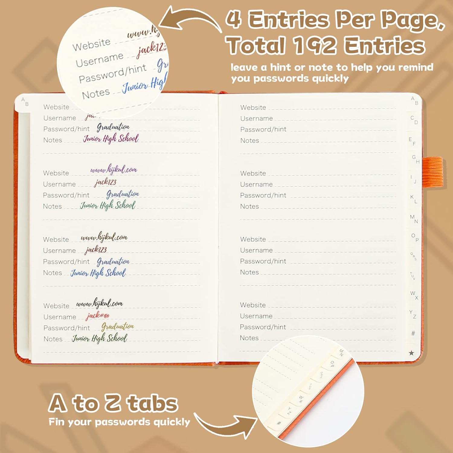 - Convenient Content Design: Password book with A-Z alphabetical tab design you can store passwords alphabetically so that they can be found quickly. It has 4 entries per page, 192 entries in total for your records. In addition, there are 9 pages for records useful Internet and computer information and 4 pages for very important and most visited websites, and 19 blank pages for another content.
