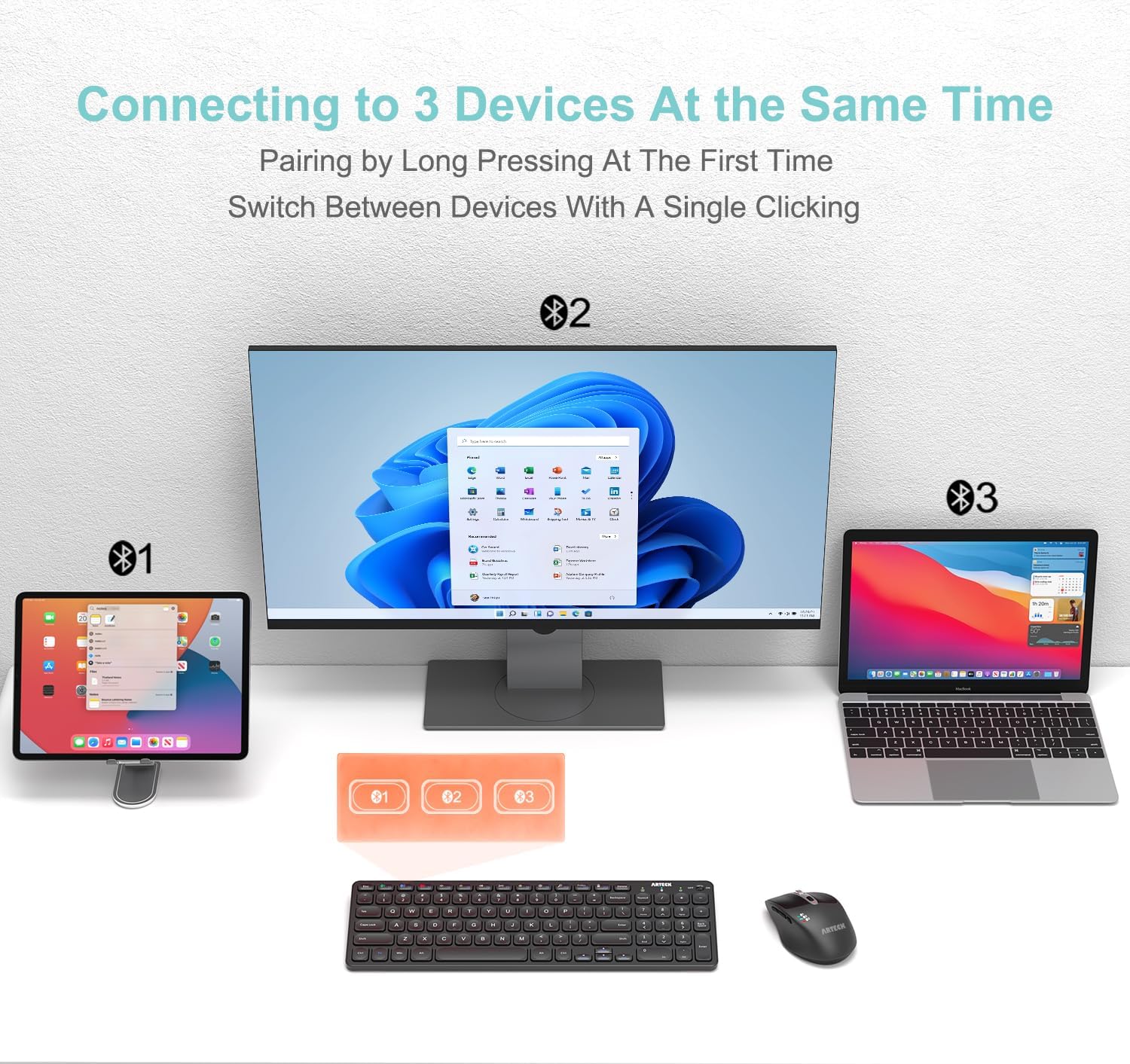 - 3 Devices Switch with A Single Clicking: This keyboard is able to connect to 3 devices at the same time. You can switch between 3 devices with a single key clicking.