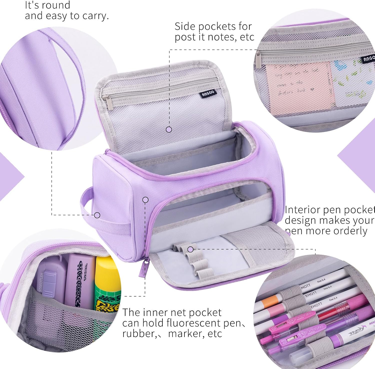 - 【Unique Design】Opens sideways (for easy-view and accessed) or from the top. Easy to carry, hand-held band. The Zipper grid pocket on top can storage triangle ruler, refills; big inner pocket can classify calculator,small pockets on both sides can keep small notes, sticky tape erasers; back zipper pocket can hold sharp objects.