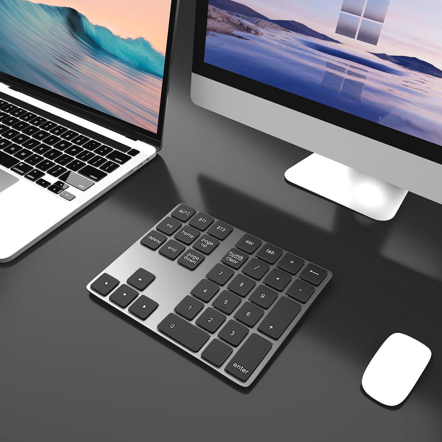 - 2.Bluetooth Number Pad for Laptop: Foloda mini 10 Keys number keyboard supports shortcut, search, NumLock, ESC, backspace, delete, tab, ins, page up/down. With shortcut keys, you can start computer calculator directly (in Windows). Numlock allows you to move the cursor without a mouse. NOTE: The calculator shortcut activates the calculator in Windows , but the search function in Mac OS. Ins is not functioning in Mac OS. Numlock is clear the calculator in Mac OS.