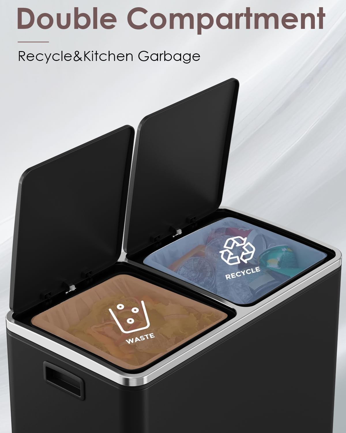 - 2*8 GALLONS COMPARTMENTS: Trash can has two independently compartments for trash and recyclables, making it easy to sort waste.