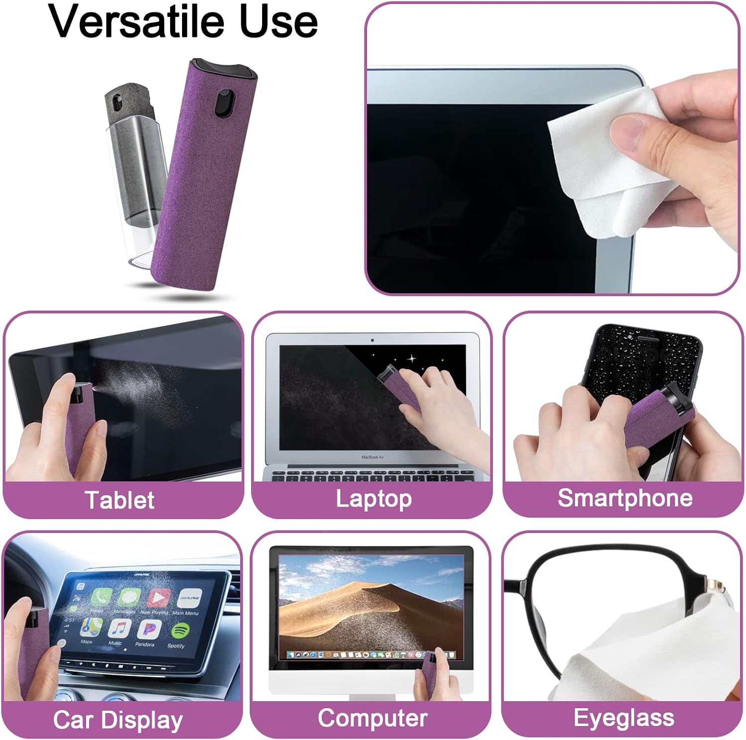 - Screen Cleaner Mist and Microfiber Fiber Cloth for Electronics: They are cleaning, antistatic, and degreasing. Easy to remove the oil and fingerprint from the screen of cell phone, tablet PC, laptop, indicator, TV, iPad, iPhone, Macbook, watch, monitors, e-Readers, Kindle car displays screen; the glass of eyeglasses, sunglasses, the lens of the camera, etc.