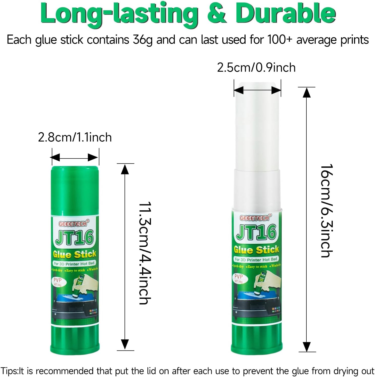 - Long-lasting & Durable: Each 3d printer adhesive contains 36g/1.26 ounce of white glue and can last use for 100+ average prints. It is recommended that put the lid on after each use to prevent the glue from drying out.