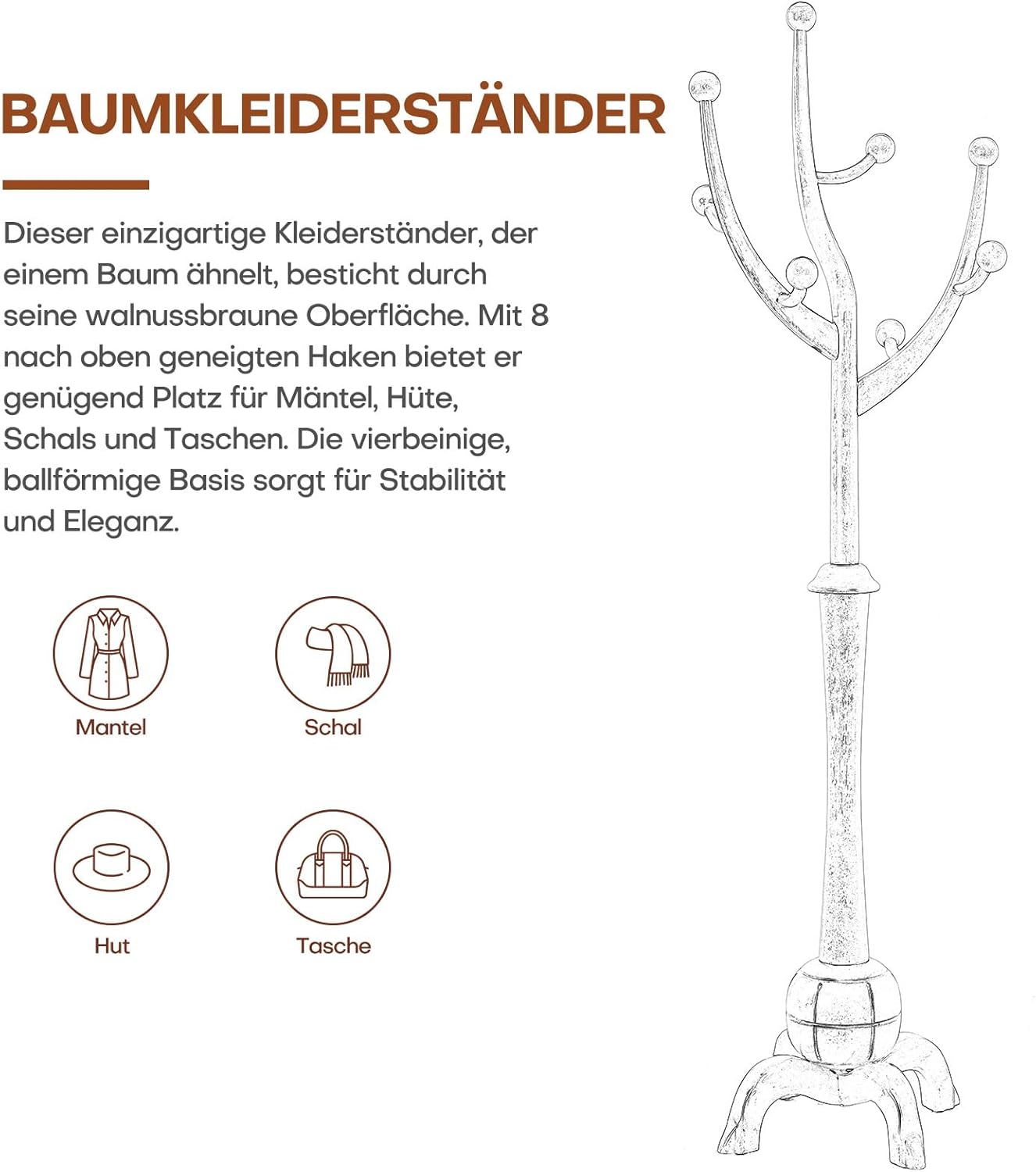 - 【Premium Material】: This tree coat rack is made from high-quality rubber wood logs, and does not contain artificial synthetic boards. The wood material exhibits an attractive grain and a walnut brown finish that makes it a lovely addition to any home