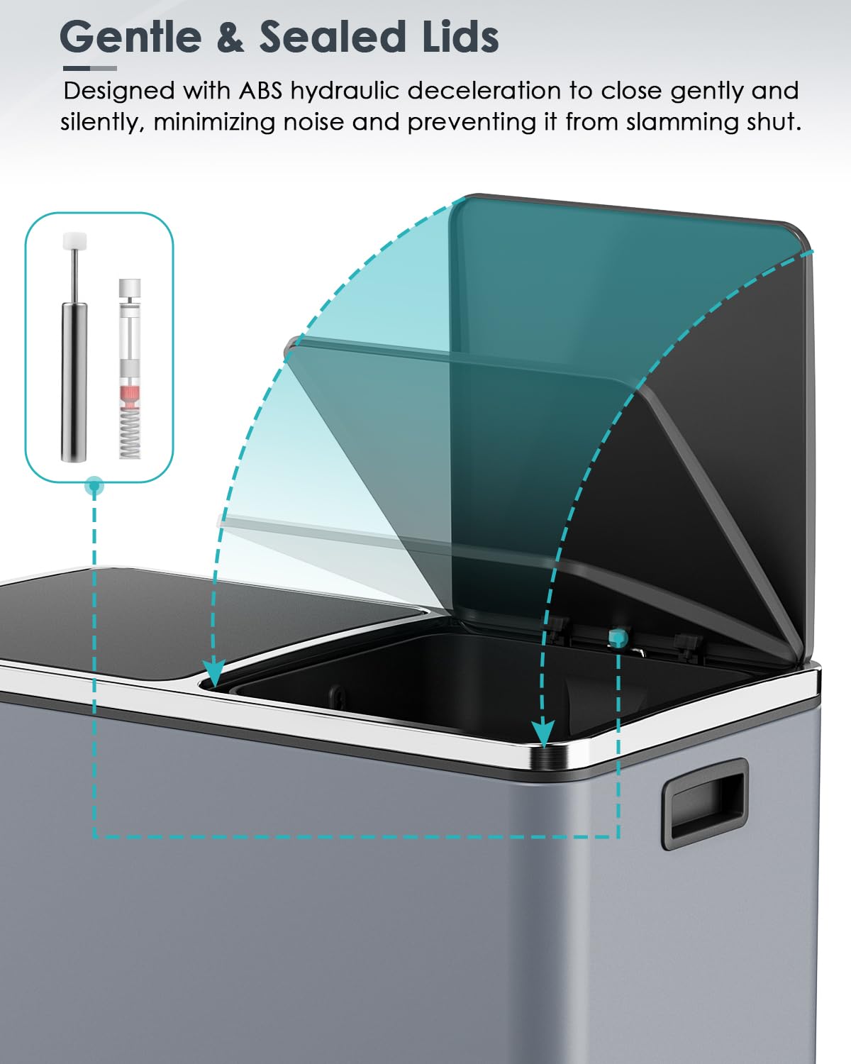 - GENTLE CLOSE: Lid of the trash can is designed with ABS deceleration, which effectively reduces the closing noise and does not make a popping sound, putting the trash can in the bedroom is also a good choice.