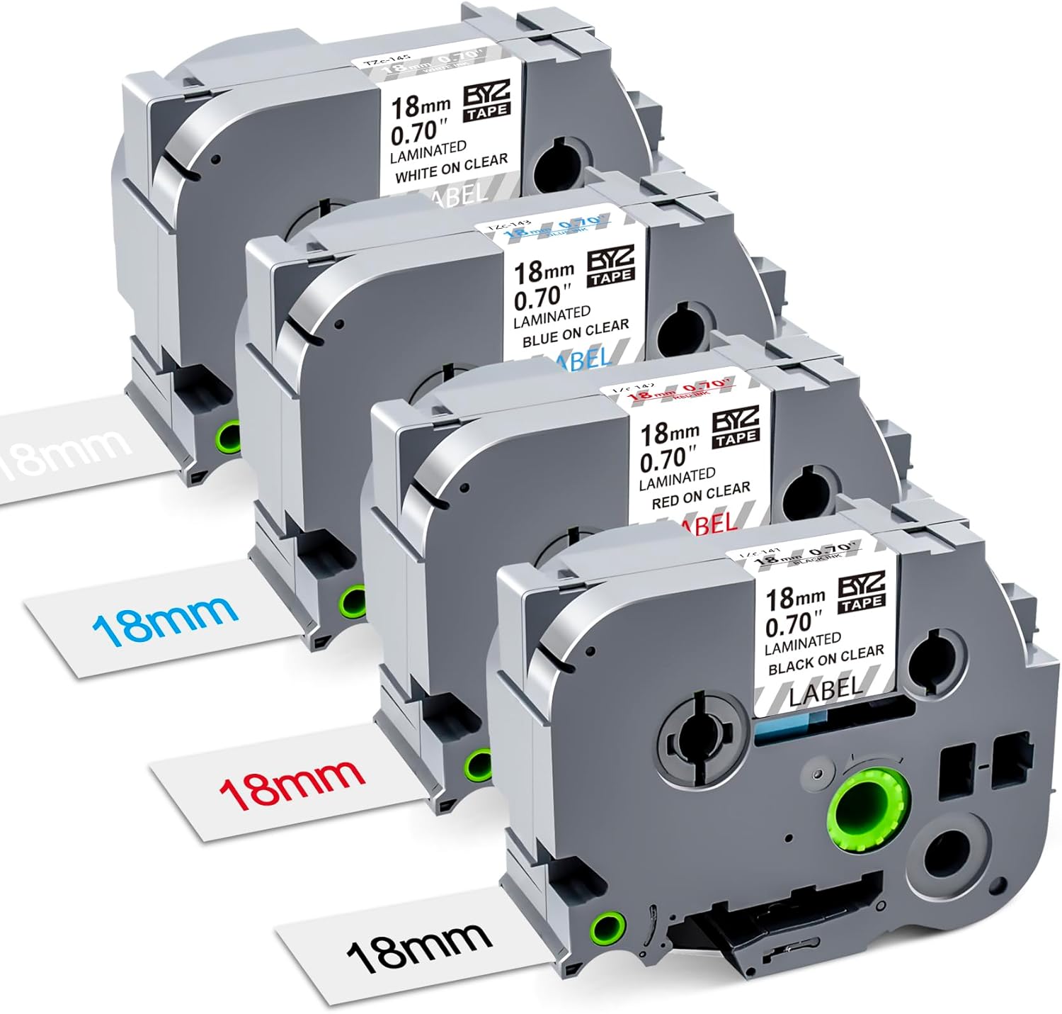 - What You Get: 4-Pack Compatible with Brother P Touch TZ Tape 18 mm 0.7 Laminated Clear. Color: TZe-141(Black on Clear) TZe-142(Red on Clear) TZe-143(Blue on Clear) TZe-145(White on Clear) Size: 3/4 Inch(18 mm 0.7inch) x 26.2 Feet (8 m)