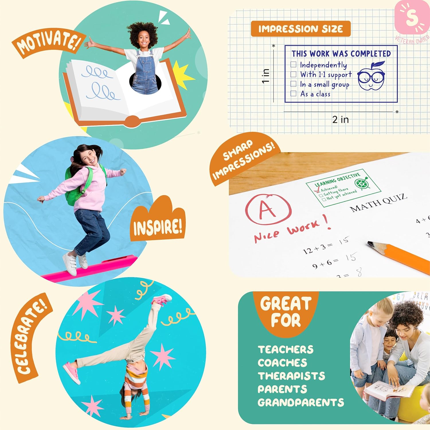 - Pre-inked Flash Stamps – “This Work Was Completed” and “Learning Objective” checkbox grading stamps
