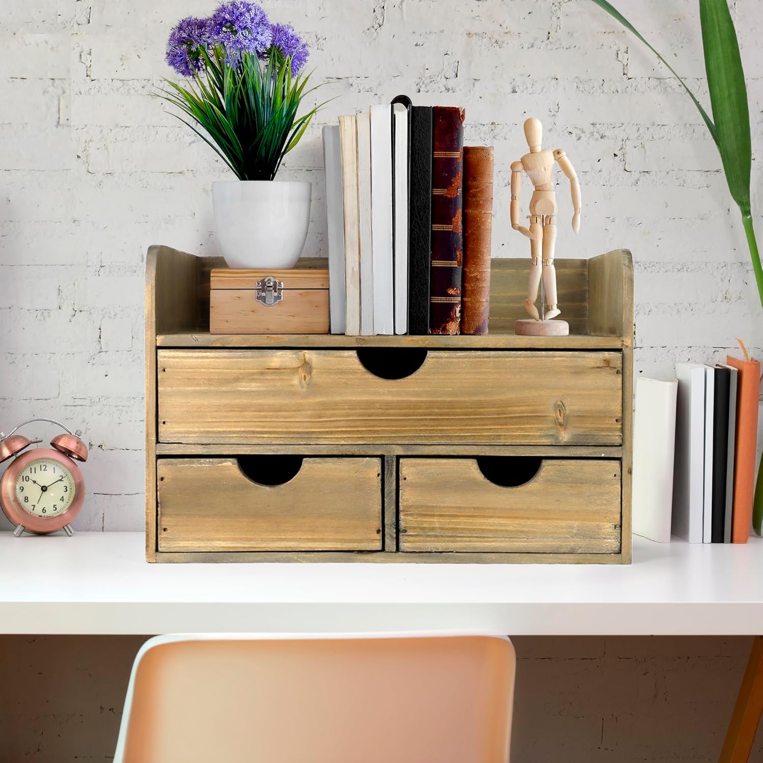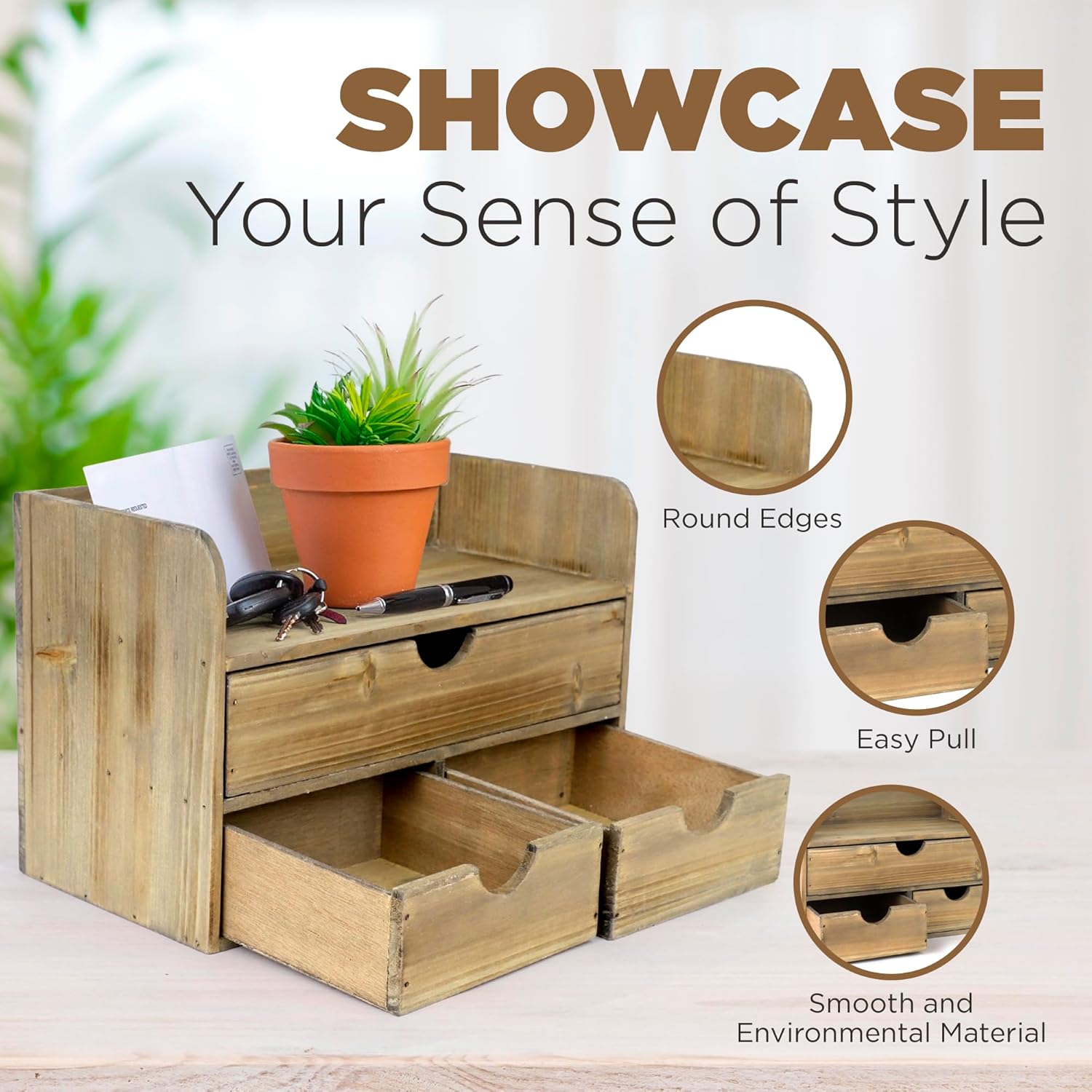 Besti Wooden Office Desk Organizer - Organizing Tool for Desktop, Cubicle, Bedroom, Kitchen - Vintage Style Organization Caddy with Top Tray Shelf & 3 Drawers - 13.6x9x7 Inches (Rustic Burnt)