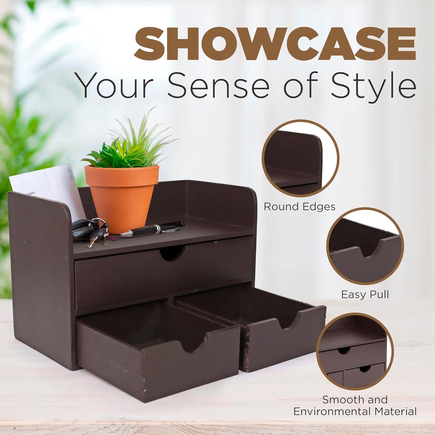 Besti Wooden Office Desk Organizer - Organizing Tool for Desktop, Cubicle, Bedroom, Kitchen - Vintage Style Organization Caddy with Top Tray Shelf & 3 Drawers - 13.6x9x7 Inches (Dark Brown)