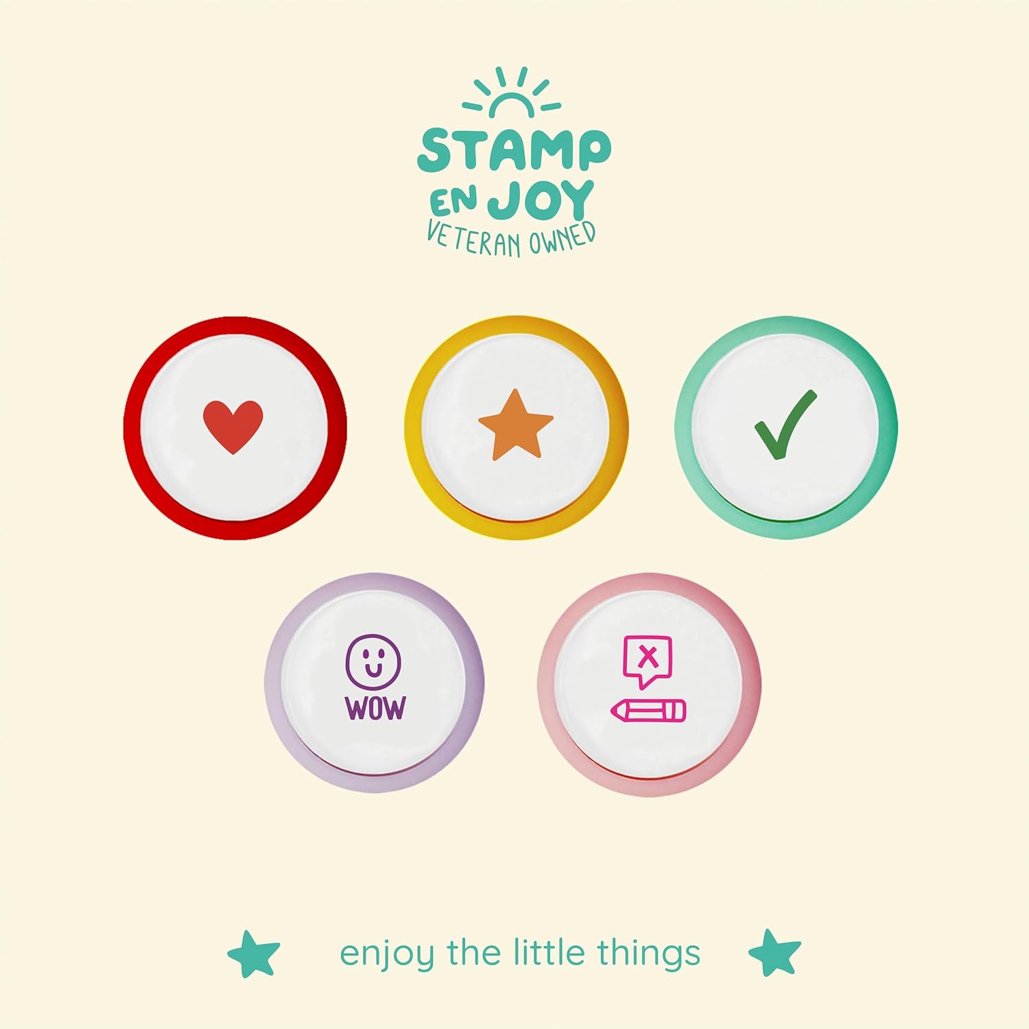 - Pre-inked Flash Stamps – Cute high quality, beautiful, vibrant, and fun stamps: WOW, Please correct, Heart, Star, and Checked