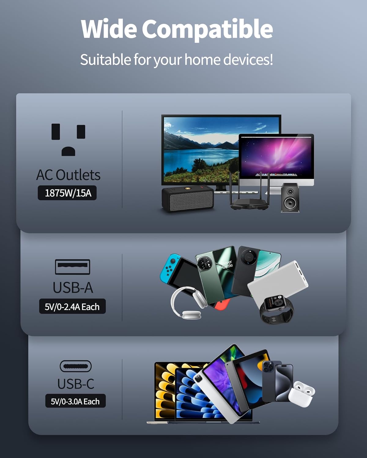 - 【Smart USB Charging】-With built-in USB slots, you don’t have to use a plug for a USB charger. And each port delivers optimized charging to smartphones, game consoles, earphones, power banks, and more (Max 5.2A/26W Shared).