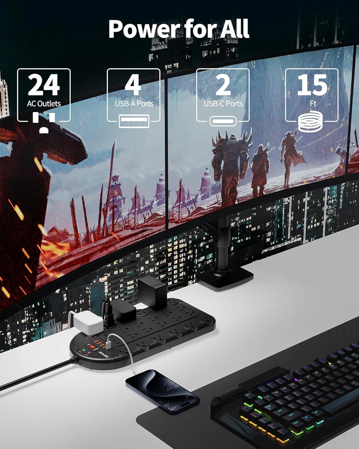 - 【Power for All】-Features 24 grounded outlets, 4 USB-A ports, and 2 USB-C ports to allow you to power up your gaming or media setup, computer, laptop, phone, and camera at the same time. One charging station for a clutter-free desk.