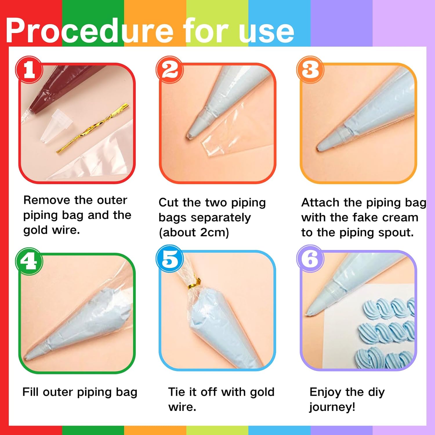 - 【Instructions for Use】 The fake whipped cream in a double-layered piping bag. Step 1: Unscrew the gold wire and take out the outer laminating bag. Step 2: Use scissors to cut the outer laminating bag and the inner laminating bag separately (about 2cm). Step 3: Attach the nozzle to the inner bag. Step 4: Put the inner laminating bag with the laminating nozzle into the outer laminating bag. Step 5: Tie the end with a gold wire.