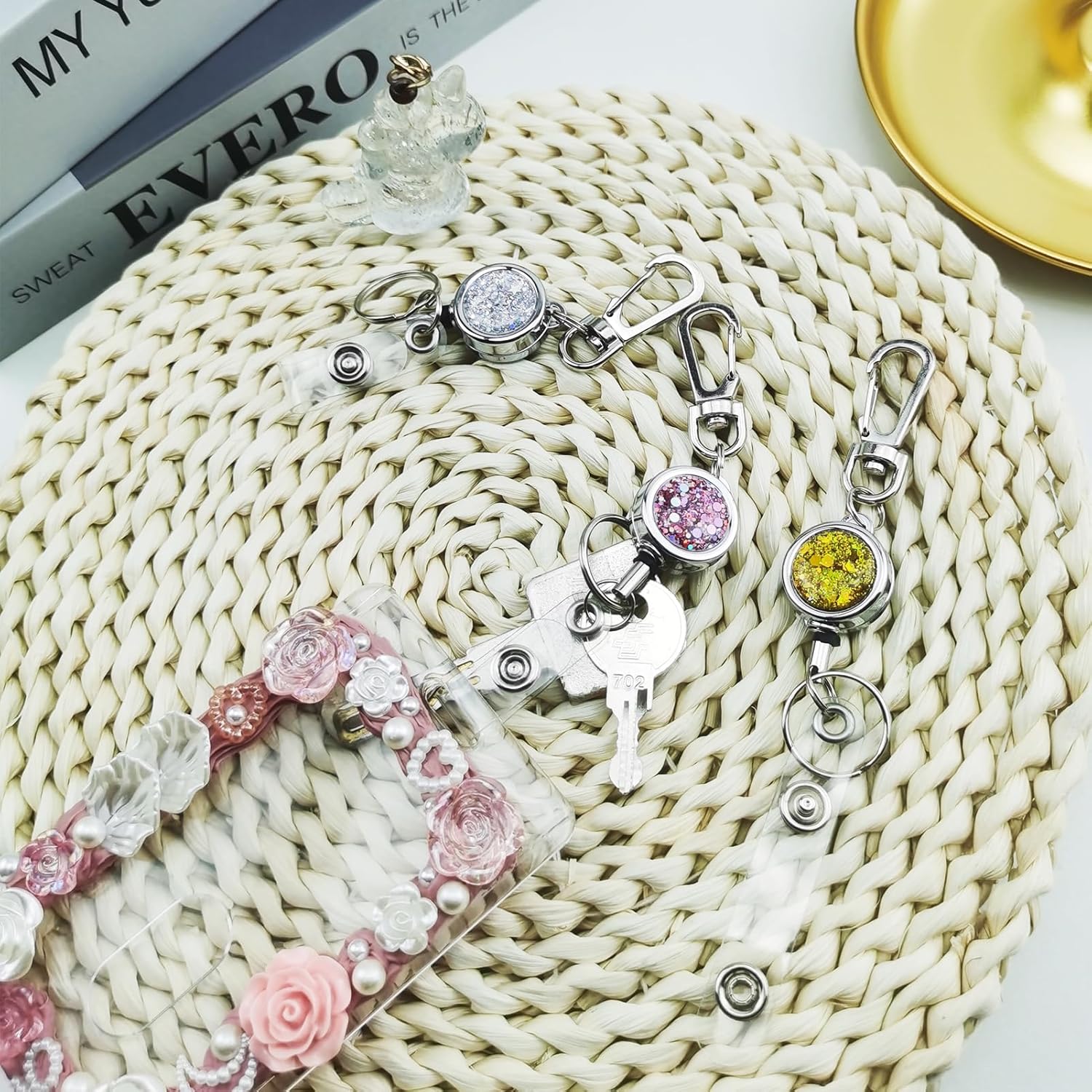 bolimoss Glittery Badge Holder Reel Retractable for Women Girls, Metal Badge Holder with Belt Clip Key Ring and Reinforced Steel Cord for ID Card Keychain (3 Pack Pink)