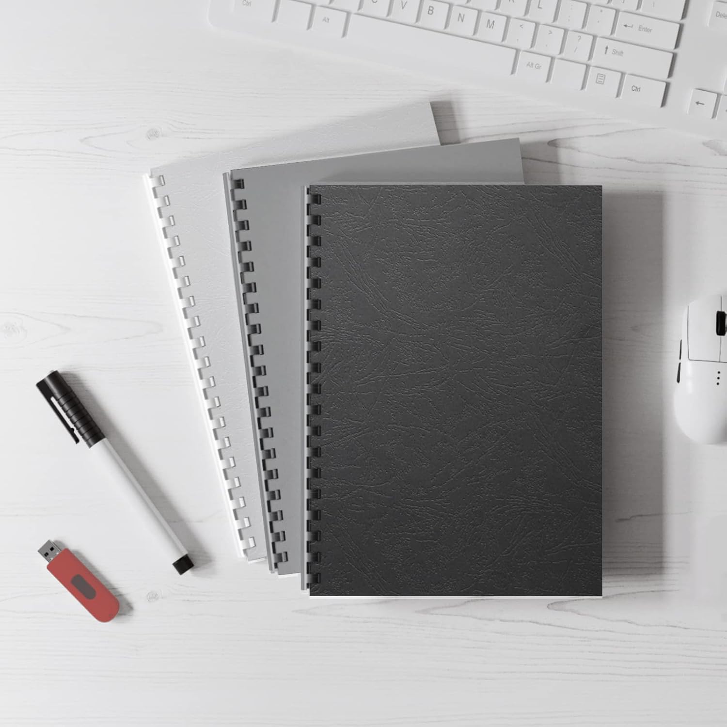 - Sand & Leather Textured: Plastic binding back covers are designed with a leather-texture on one side, and a sand-texture on the reverse. (Attention: leather-like appear, not made from leather)