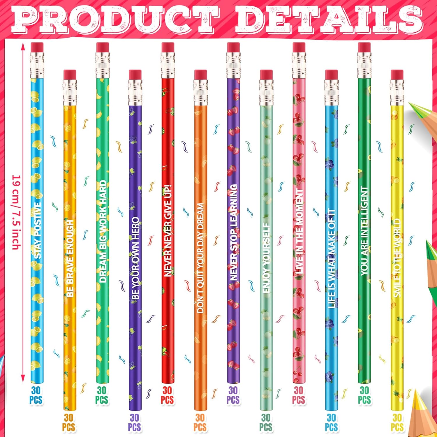 - What's Included in the Package: you will receive 360 pieces of scented pencils in 12 styles, 30 pieces in each style, measuring approx. 19 cm/ 7.5 inches in length, with red, yellow, purple and more, and each color is printed with fruit patterns and motivational sayings, sufficient quantity and diverse styles to meet your daily use and replacement needs