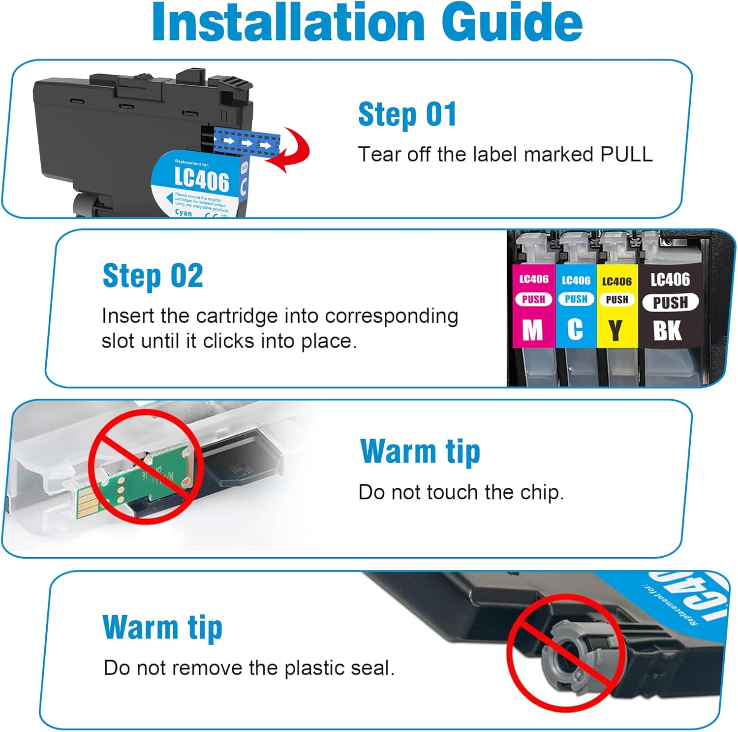 - Easy to Install: Each our LC406 cartridge is packed individually for easy replacement and storage. You can replace an individual ink by just 2 steps: Remove the Yellow Seal Tape carefully >>> Insert into corresponding slot in your printer