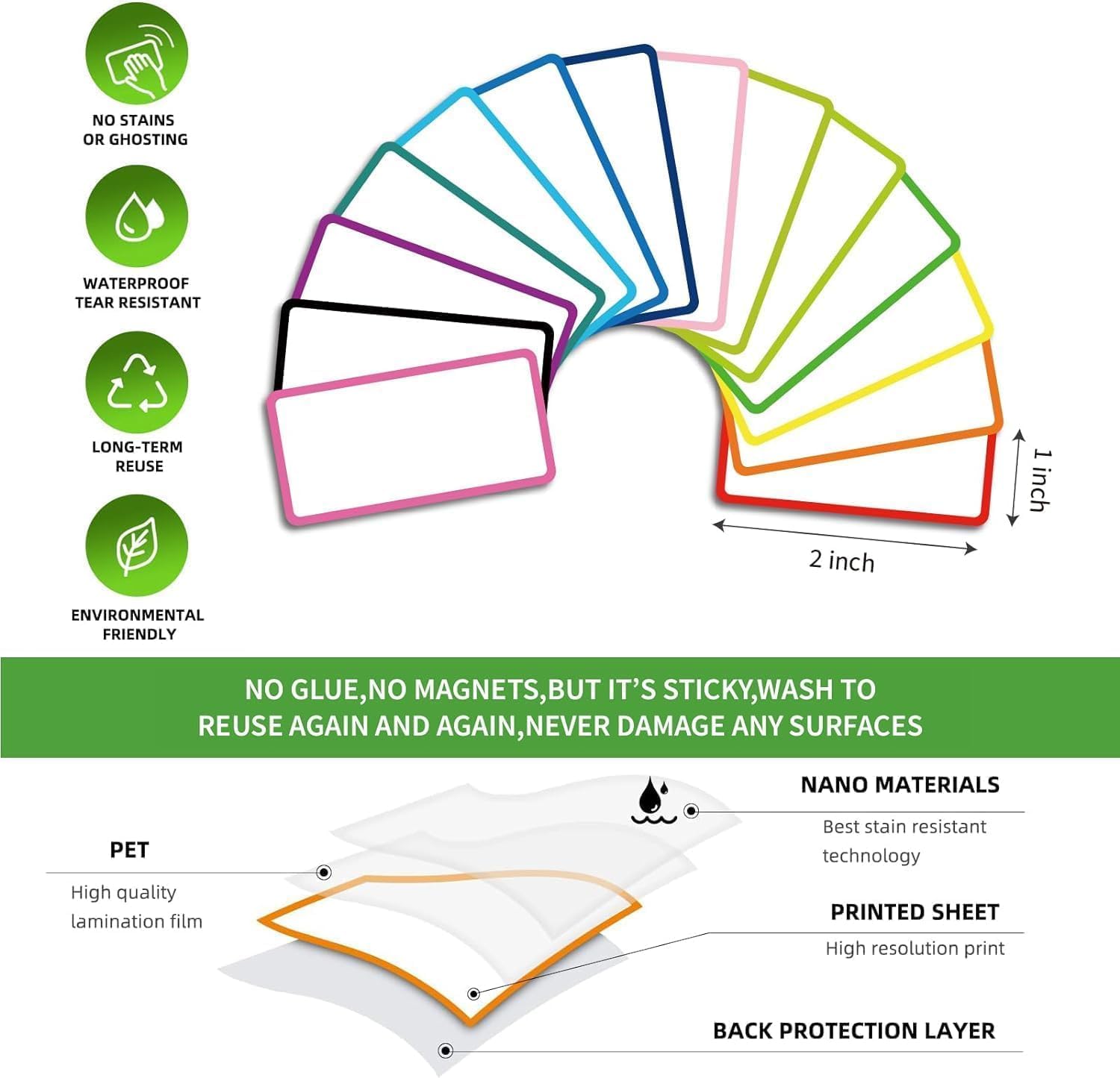 - 💖Reusable Dry Erase Labels: dry erase sticky labels are made of Freon-free Nano Material and dry erase film, smooth writing and wipe off easily, no wear in use and easy to clean, no glue, no magnetic but can stick well, heat resistant, microwave safe, just WASH to Renew if get dirt or stickless, really reuse again and again