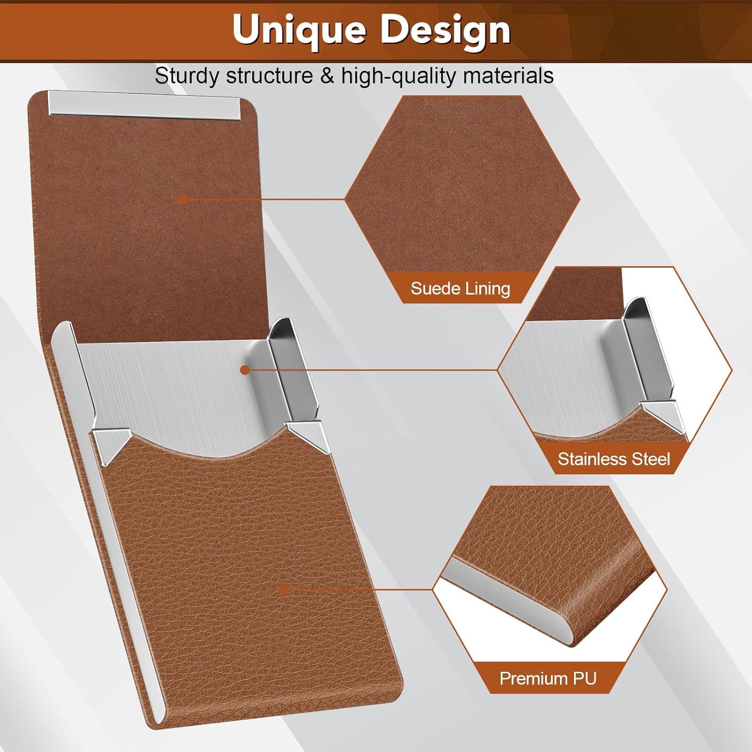 - Material: Our business card holder made of luxury PU leather and high quality Stainless Steel. It has a good solid construction, use longer.