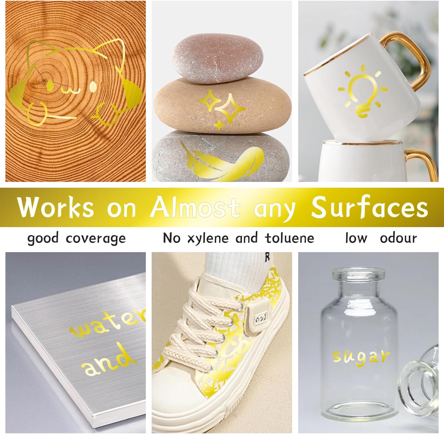 - Gold Paint Markers: Gold paint pens are made up of a long-lasting oil-based opaque ink, Low odor. The ink resists fading, water and abrasions, designed to stand out on both light and dark surfaces. Paint markers can be used on glass and once dry they will be permanent and waterproof