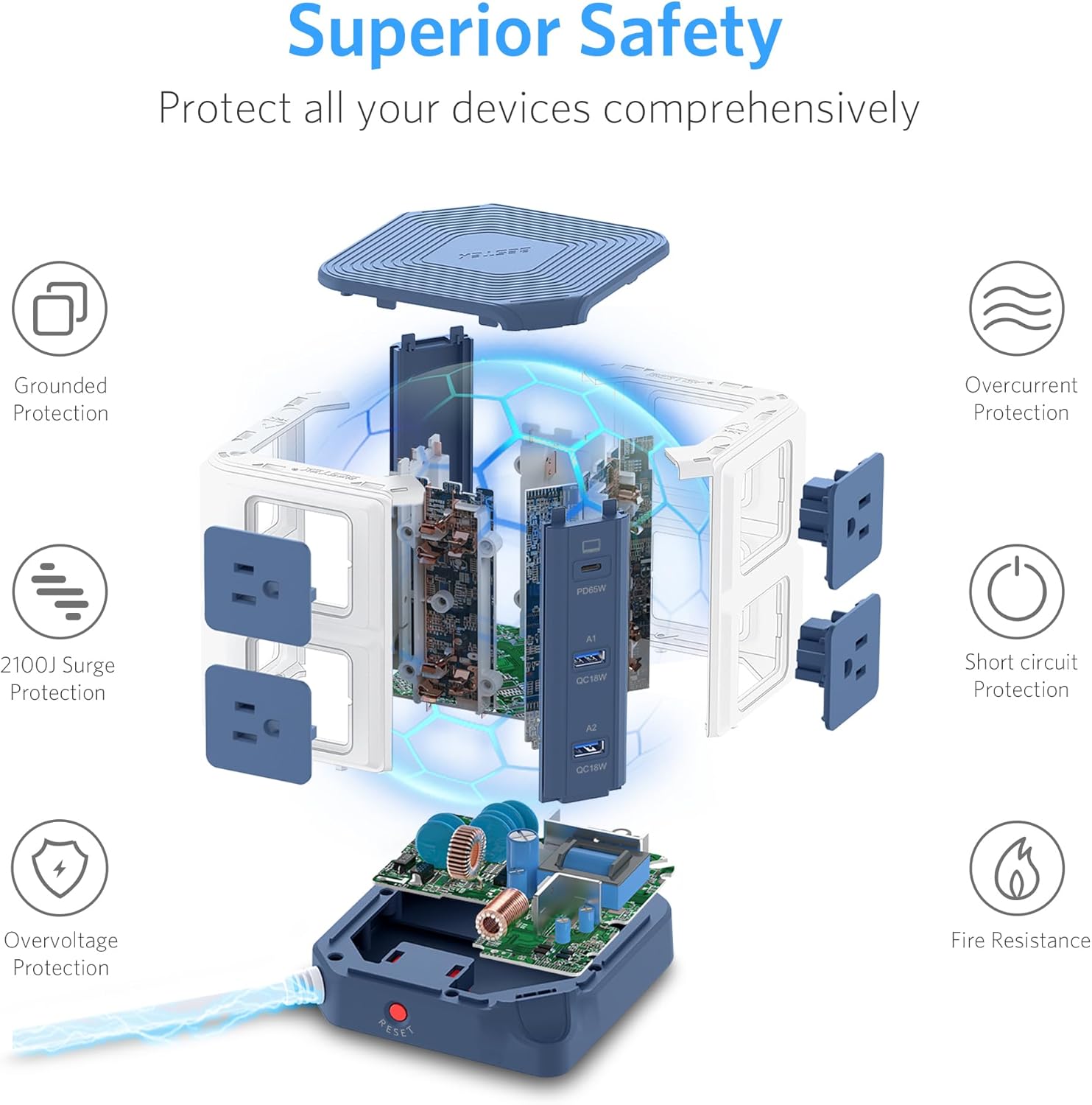 - 11-in-1 Power Strip with USB Ports: 8 outlets extender with 2 USB-A Ports and 1 USB-C PD 65W port to make full use of this power strip, and charge multiple devices at once.