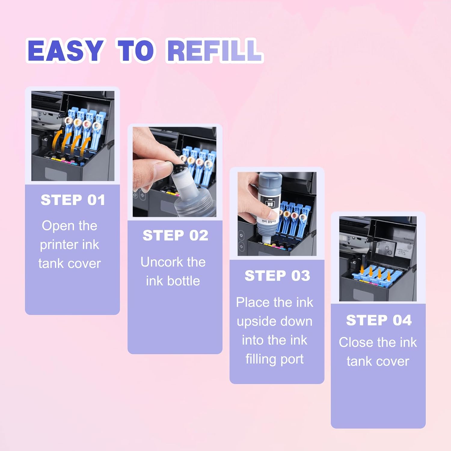 - High Page Yield – Up to 7500 pages per bottle based on 5% coverage on A4. With ultra-high capacity (127ml / bottle), you'll be able to print more pages per cartridge, saving you time and money in the long run. Get more done without constantly replacing cartridges.