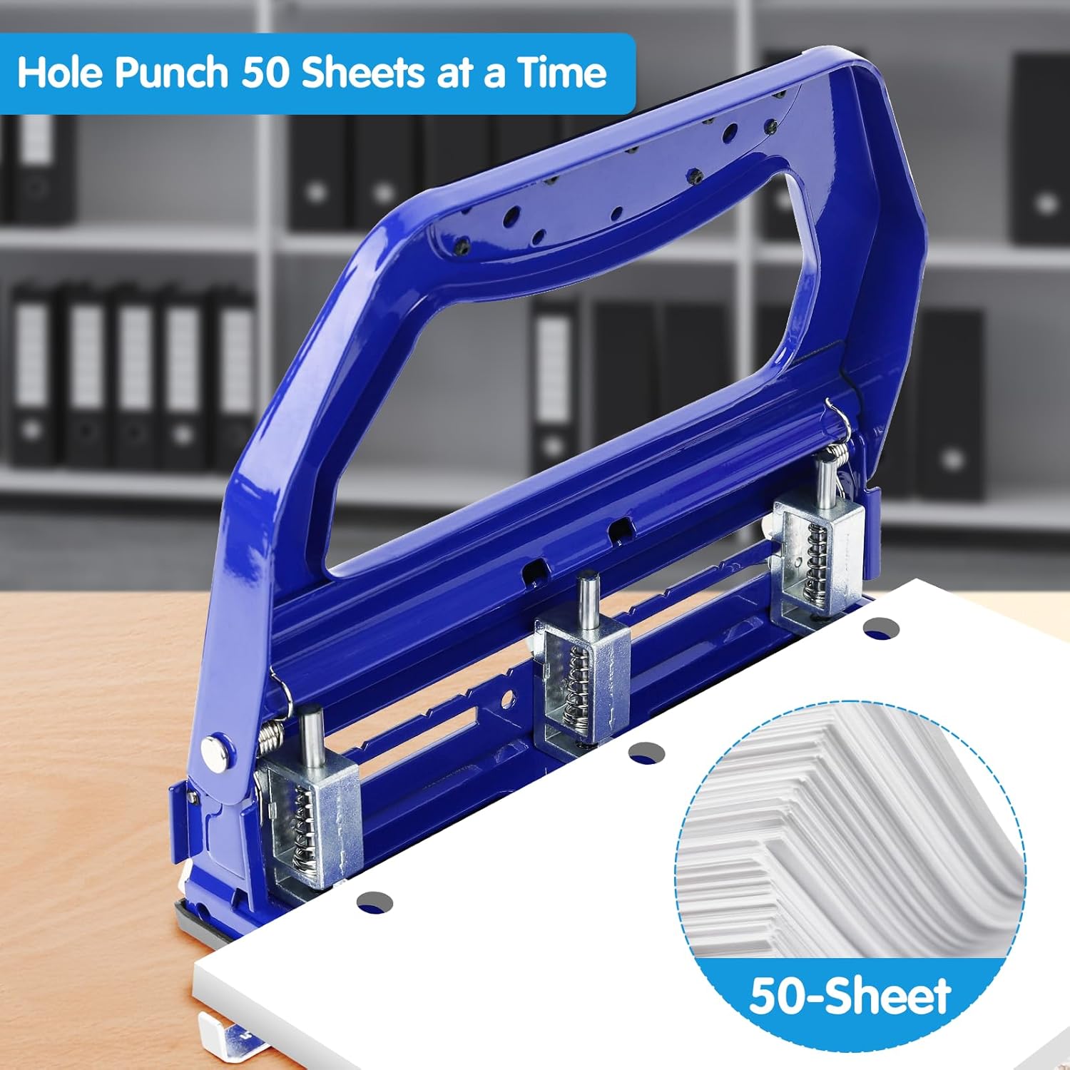 AFMAT 3 Hole Punch, Metal Heavy Duty Paper Punch with 50-Sheet Capacity and Removable Punch Heads for 2 Hole Punch Function, Large Chip Tray, Blue