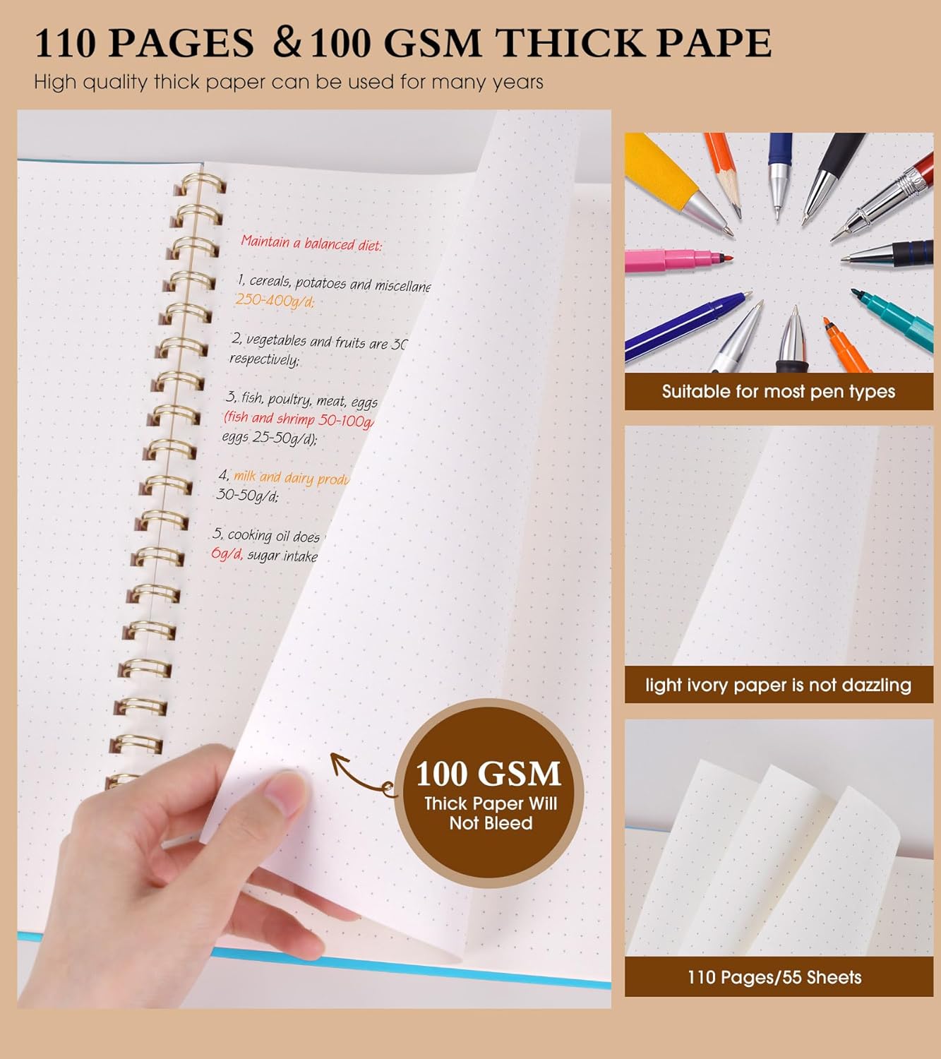 - 【100 GSM Ink-friendly Paper】 Our blue spiral dot grid notebook pages are very thick, which avoids ink bleeding through and ghosting. Suitable for most pen types, such as ballpoint pens, fountain pens. Each dotted journal 55 sheets/110 pages, offering enough space to write in. Allowing you to write on both sides of every page to maximize your usable space. light ivory paper is not dazzling, let you have a comfortable writing experience.