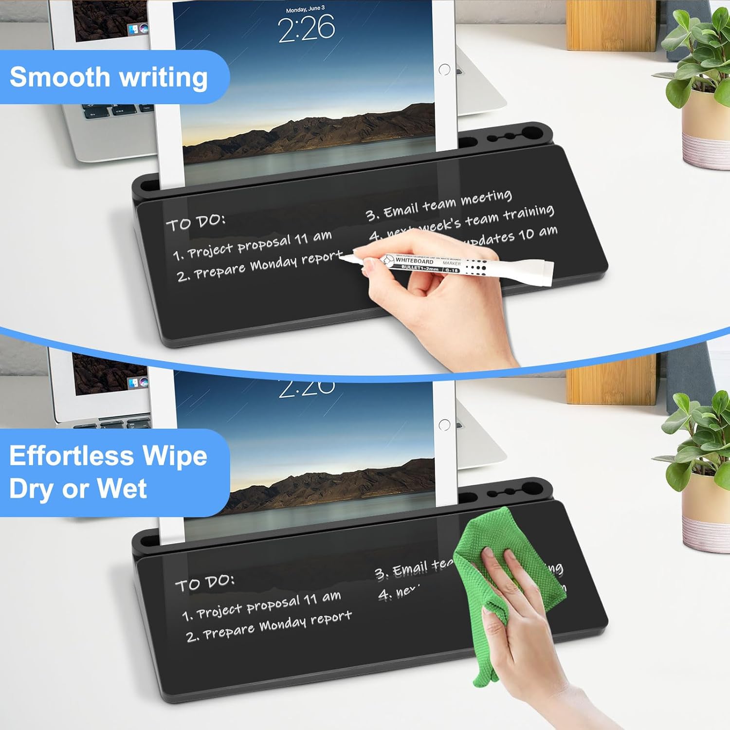 - Compact Size for Desk - Sitting compactly between your computer and keyboard, this small glass whiteboard can maximizes your workspace. The dimension of the product is 15.7 x 7 x 2 inches, which make it as a valuable addition to office. At the same time, it can enhance office organization and efficiency.