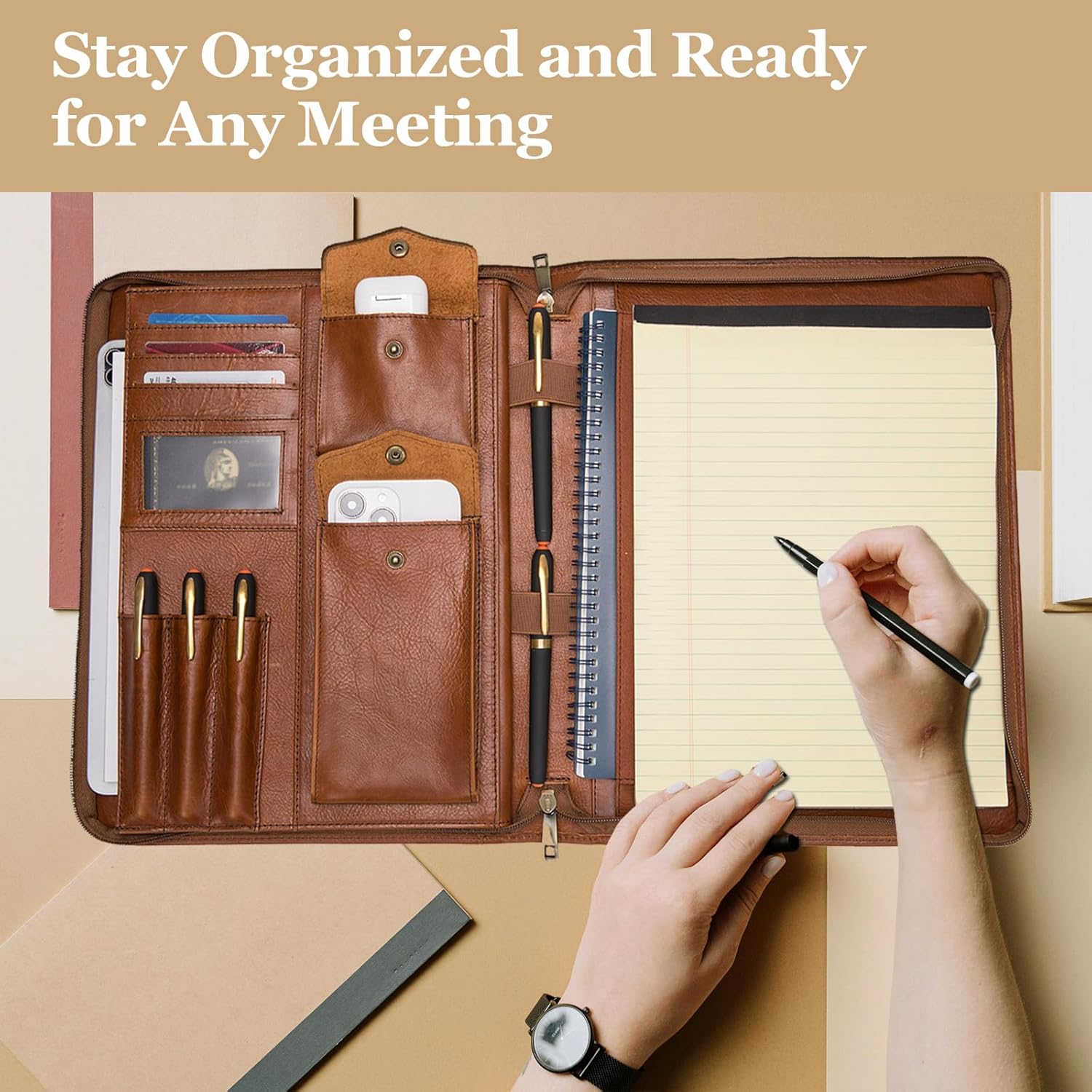 Genuine Leather Portfolio with Hidden Handle, Zippered Front Pocket, Business Padfolio for Men and Women, 8.5 x 11 Legal Pad Notebook Holder, Office Letter Notepad Folio, Oil Tanned