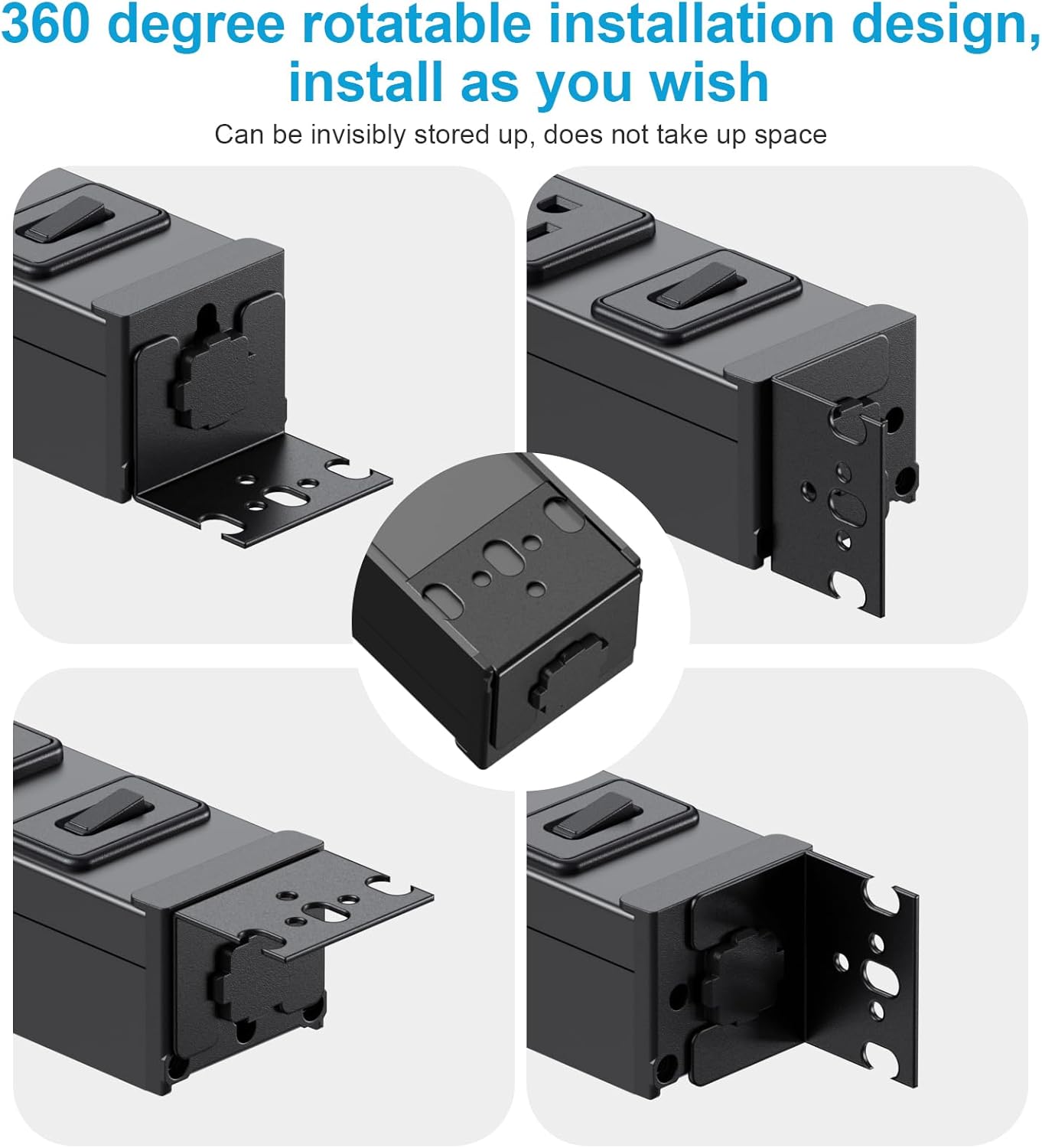 HHSOET 360° Rotating 12 Outlet Mountable Power Strip, Metal Gaming Table Mounted Outlet Strip, Heavy Duty Wall Mount Surge Protector with Switch, Works Great and Very Versatile, 6ft Power Cord.Black
