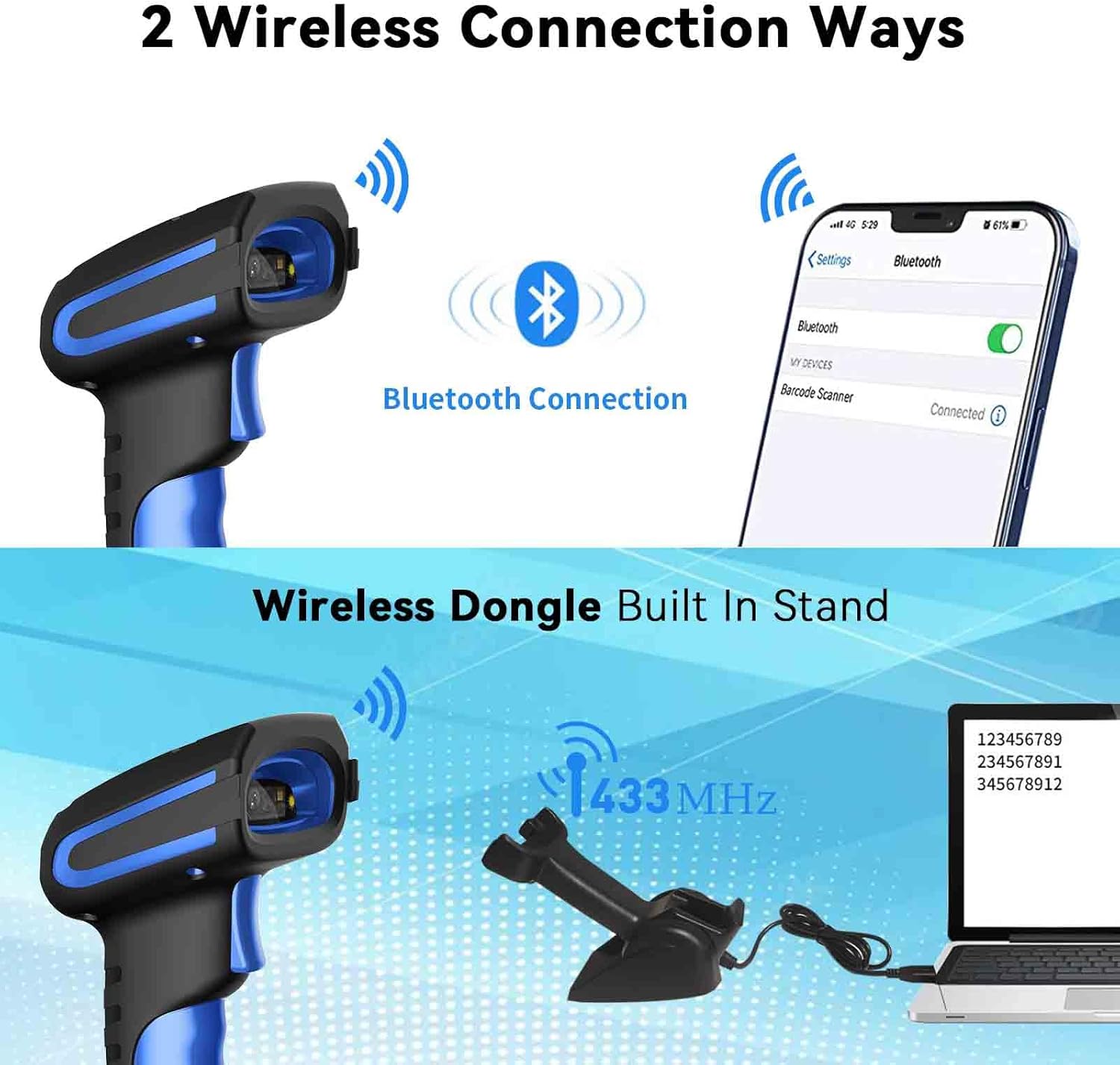 Alacrity Upgraded 2D Industrial Barcode Scanner with Wireless Charging Stand, 1968 Feet Transmission Distance 433Mhz Wireless & Bluetooth 2in1 Barcode Reader, Shock Dust Proof Hands Free, Blue