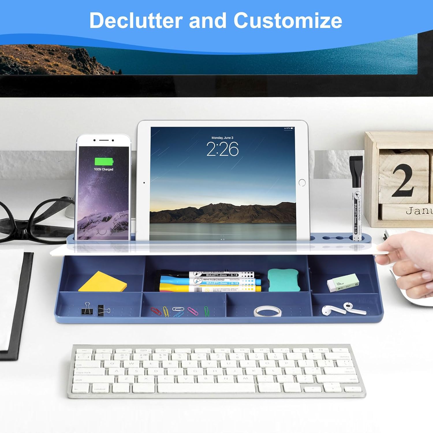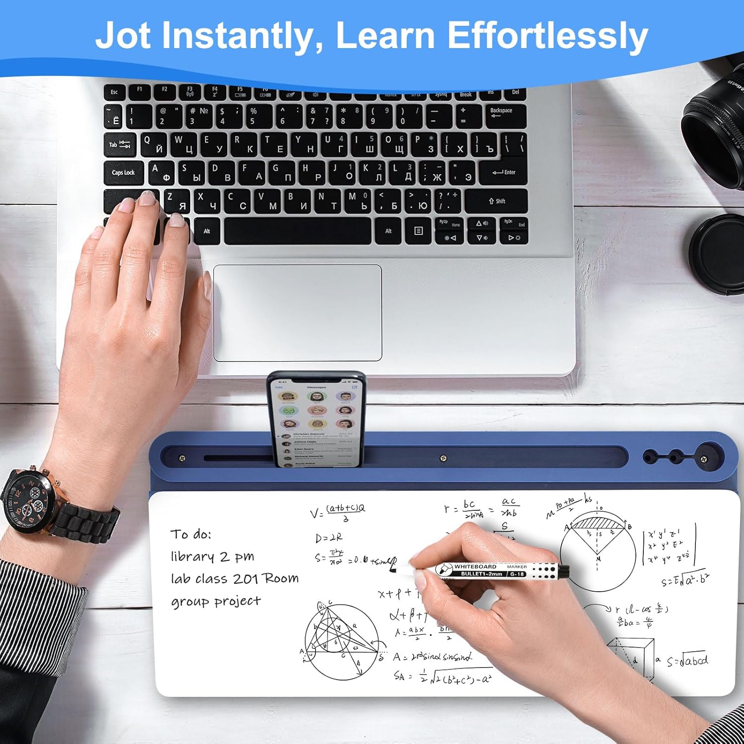 - Multiple Functions - To enhance the overall convenience of the product, this whiteboard includes 1 large pen holder, 2 small pen holders and 1 slot on the top which can hold 3 markers, a tablet and a phone. Equipped with charging port notch in the slot, the desk board is a good option to realize office charging, and you can charge your phone quickly. This dry erase board is more ergonomic with the perfect ramp design and non-slip design, which can make itself be used as keyboard pad.