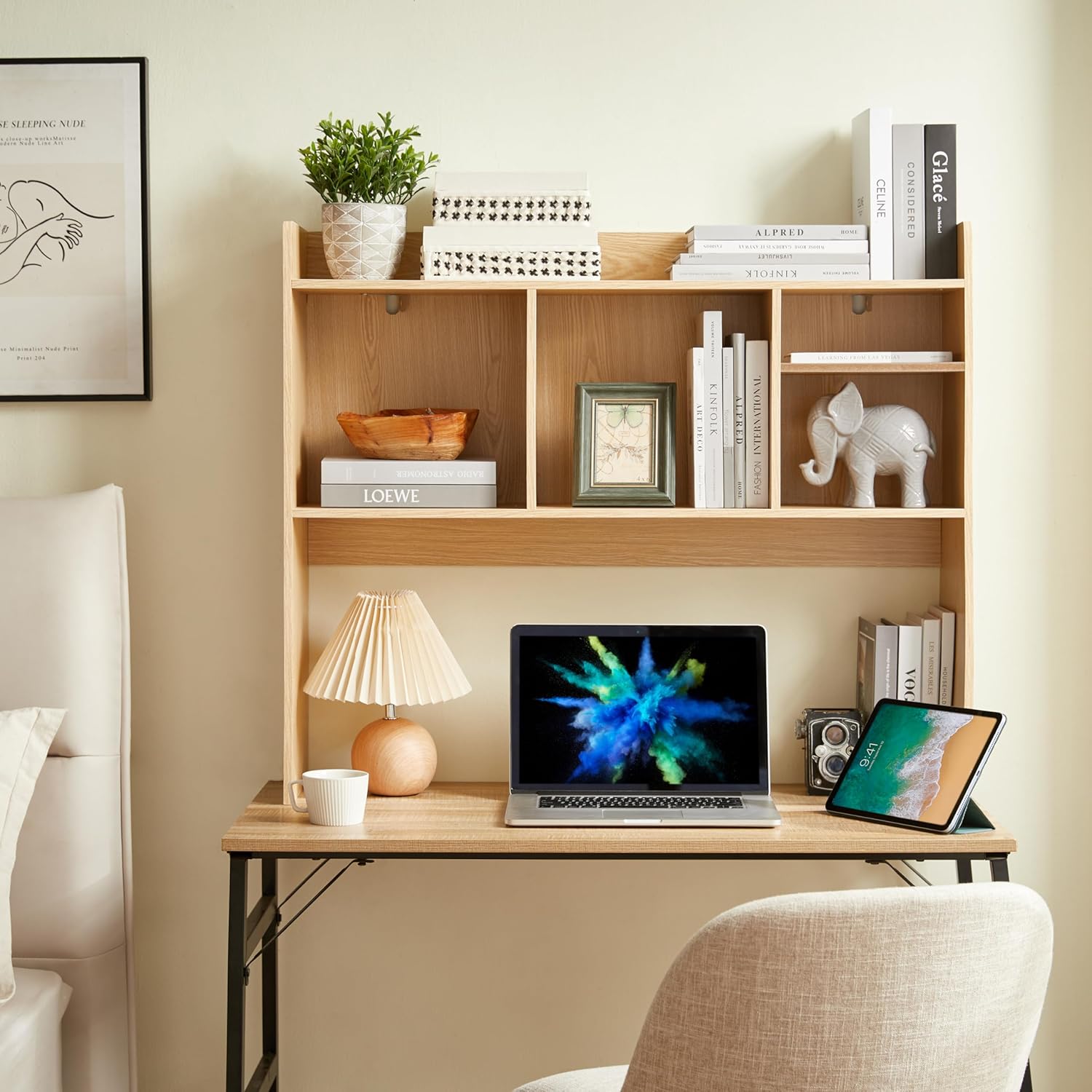 - 【Versatile and Modern Design】- The furniture hutch is versatile and complements various furnishing styles, making it an excellent choice for college dorms, home offices, and other scenarios. Whether placed on an office desk, writing table, vanity table, or any other space lacking storage, this desktop bookshelf adds a touch of modern elegance while offering practical storage solutions.