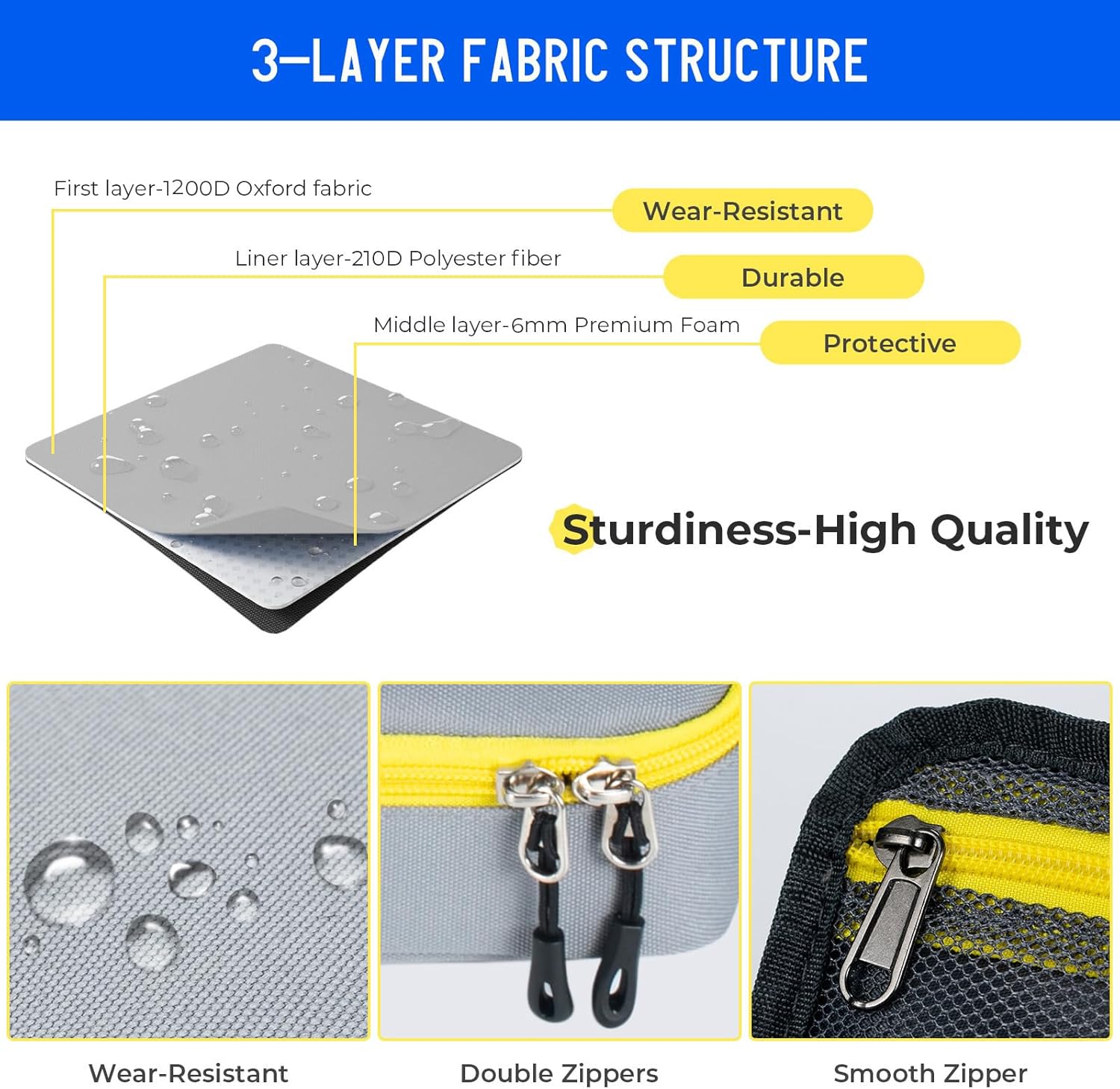 - PREMIUM MATERIAL: Pencil Bag has an upgraded 3 layer fabric structure. The exterior is made of high quality 1200D Oxford fabric, which is comfortable, water resistant, impermeable, scratch, and hard wearing. The interior is 6mm foam padded to provide softer support and more protection for your essentials. Double zips with silicone sliders for smooth operation and easy grip