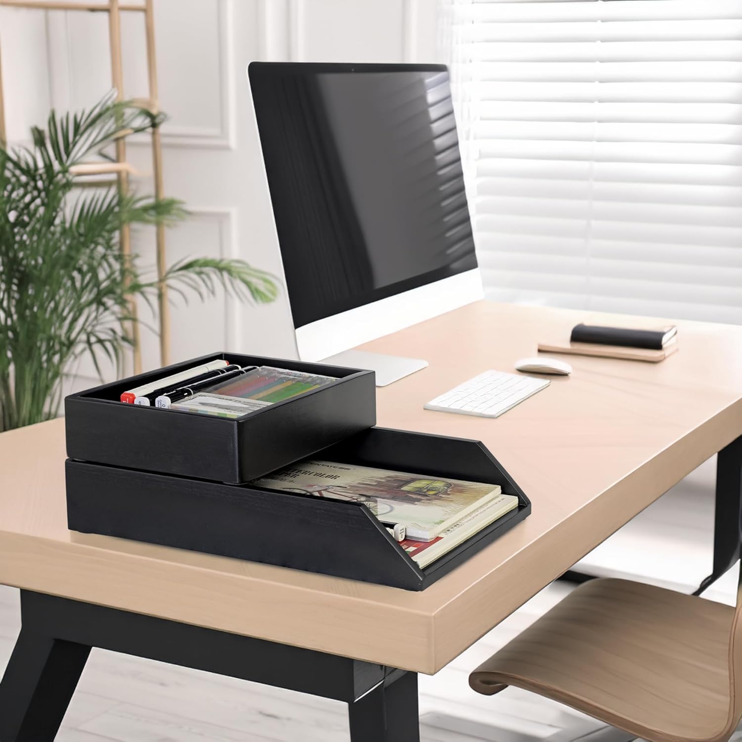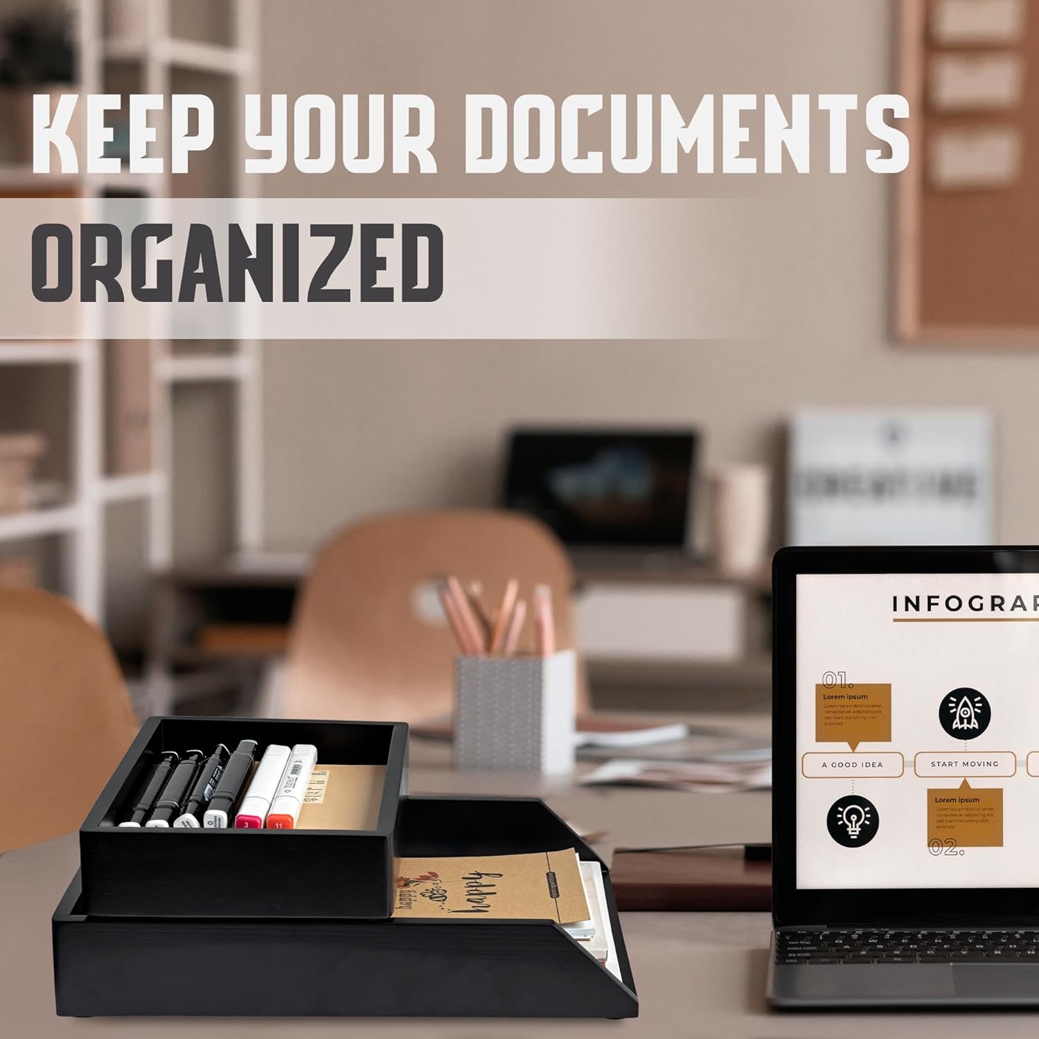 Demigo Desk Organizer Letter Tray Set of 2, Acacia Wood Tabletop Desktop for Storage Paper Letter Folders Notebooks Copy Print, Workspace Holder, Keep Stationery Saver (Black)