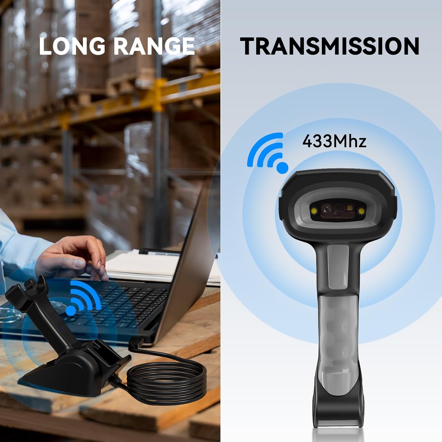 - 【Improved Access with Flexible Connectivity】 Combining 433MHz wireless and Bluetooth technology, Alacrity scanner offers dual connectivity options for seamless operation. With a transmission range of up to 250 meters in barrier-free environments, users can effortlessly scan barcodes from a distance, enhancing productivity and convenience in diverse settings. This extended range simplifies barcode scanning in expansive environments like warehouses, manufacturing facilities, and retail stores, enabling users to efficiently capture data from remote locations without being tethered to the scanner.