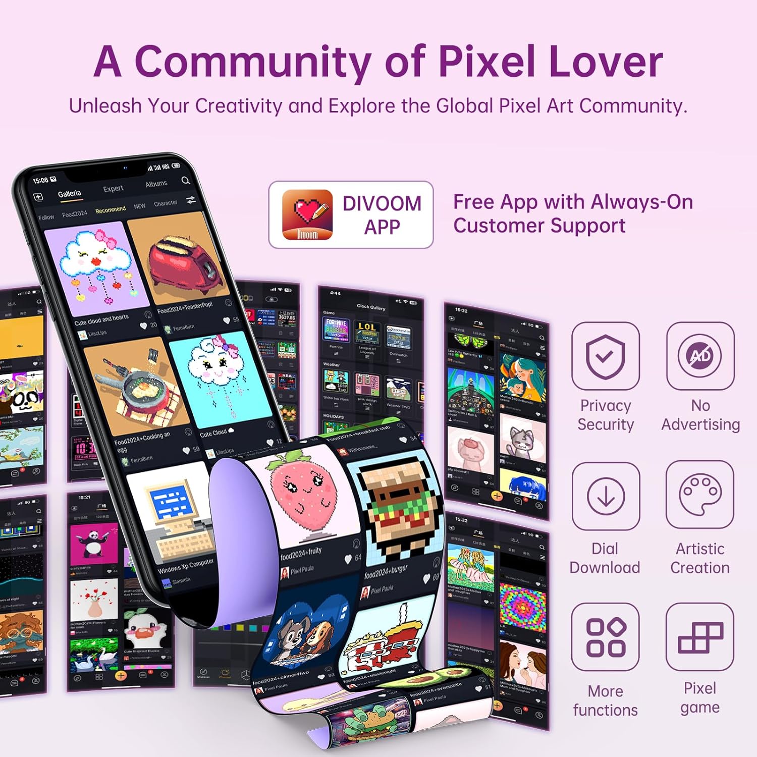 - 【Divoom Time Gate】- The Time Gate redefines digital clocks by combining chic style with cutting-edge technology. Its radiant pink LED display, boasting 128x128 pixel resolution, not only tells time but also enhances your space with mesmerizing pixel art and lively GIFs, perfect for adding a touch of elegance to any home or office.